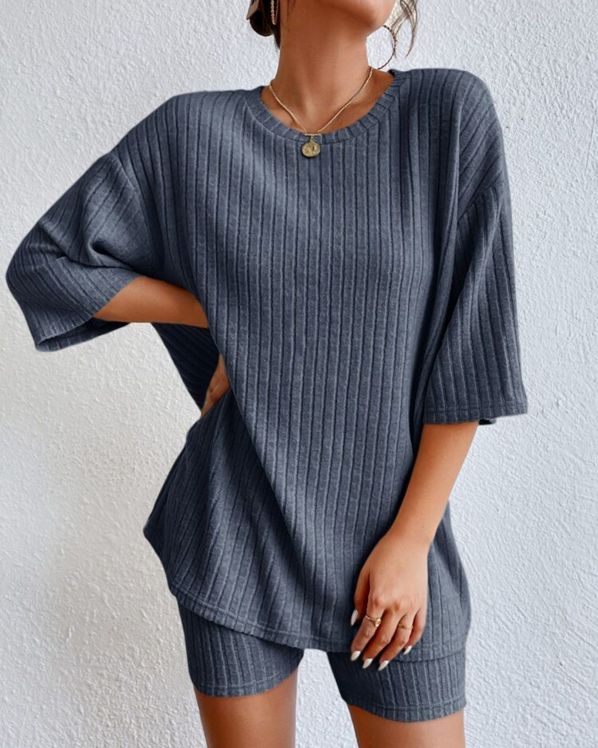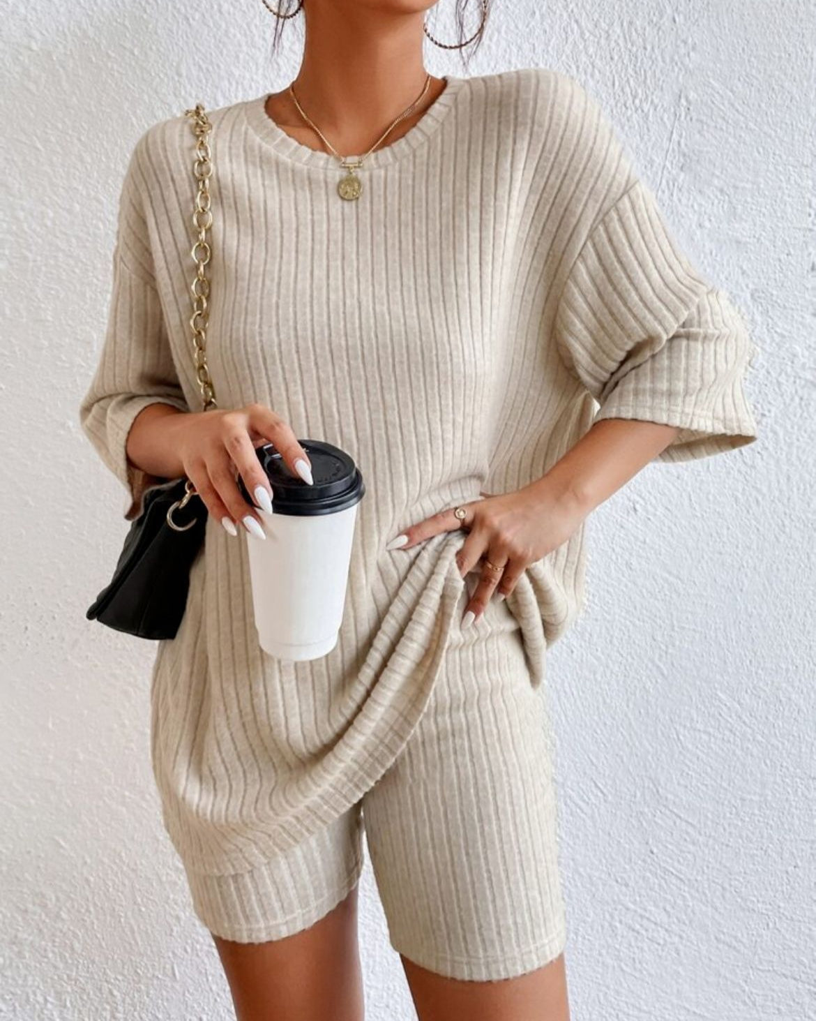 AMÉLIE to elegancki i wygodny dwuczęściowy zestaw, który łączy modny design z najwyższym komfortem. Zestaw składa się z krótkiego, oversize'owego topu z okrągłym dekoltem i pasujących szortów, wykonanych z miękkiego i prążkowanego materiału, który przyjemnie przylega do skóry. Idealny na ciepłe wiosenne dni, lato, relaks w domu lub na swobodny, elegancki look.