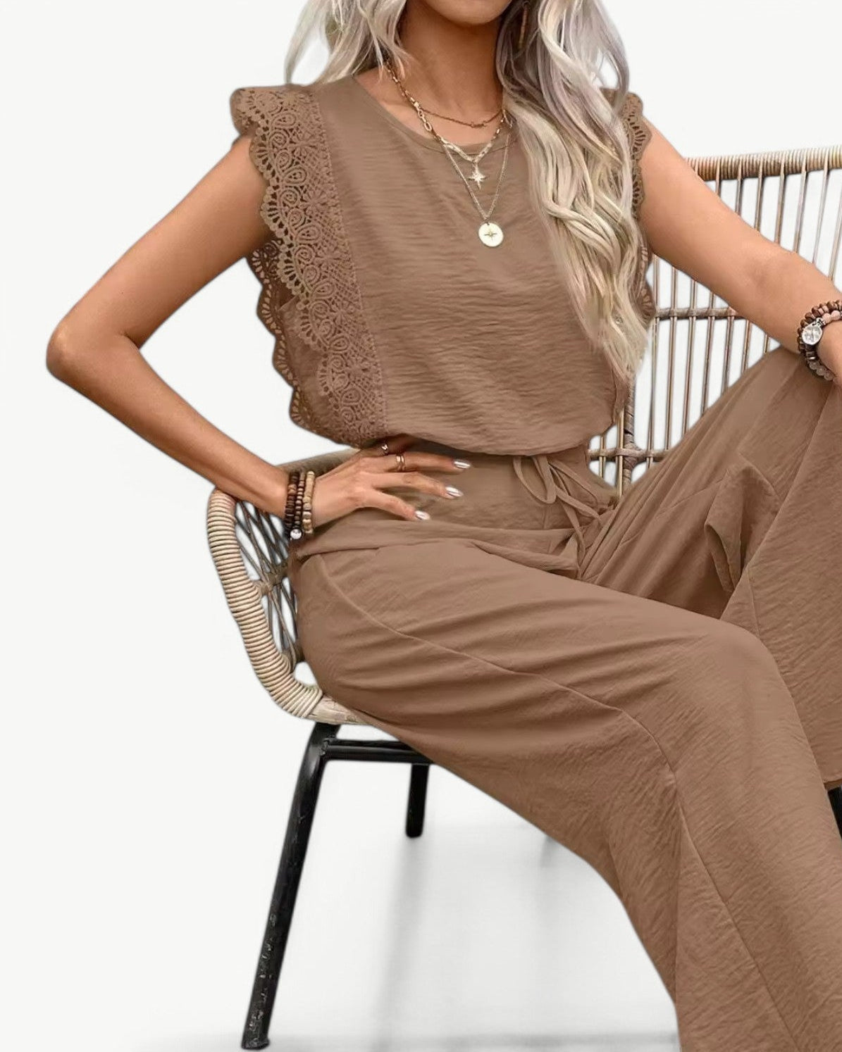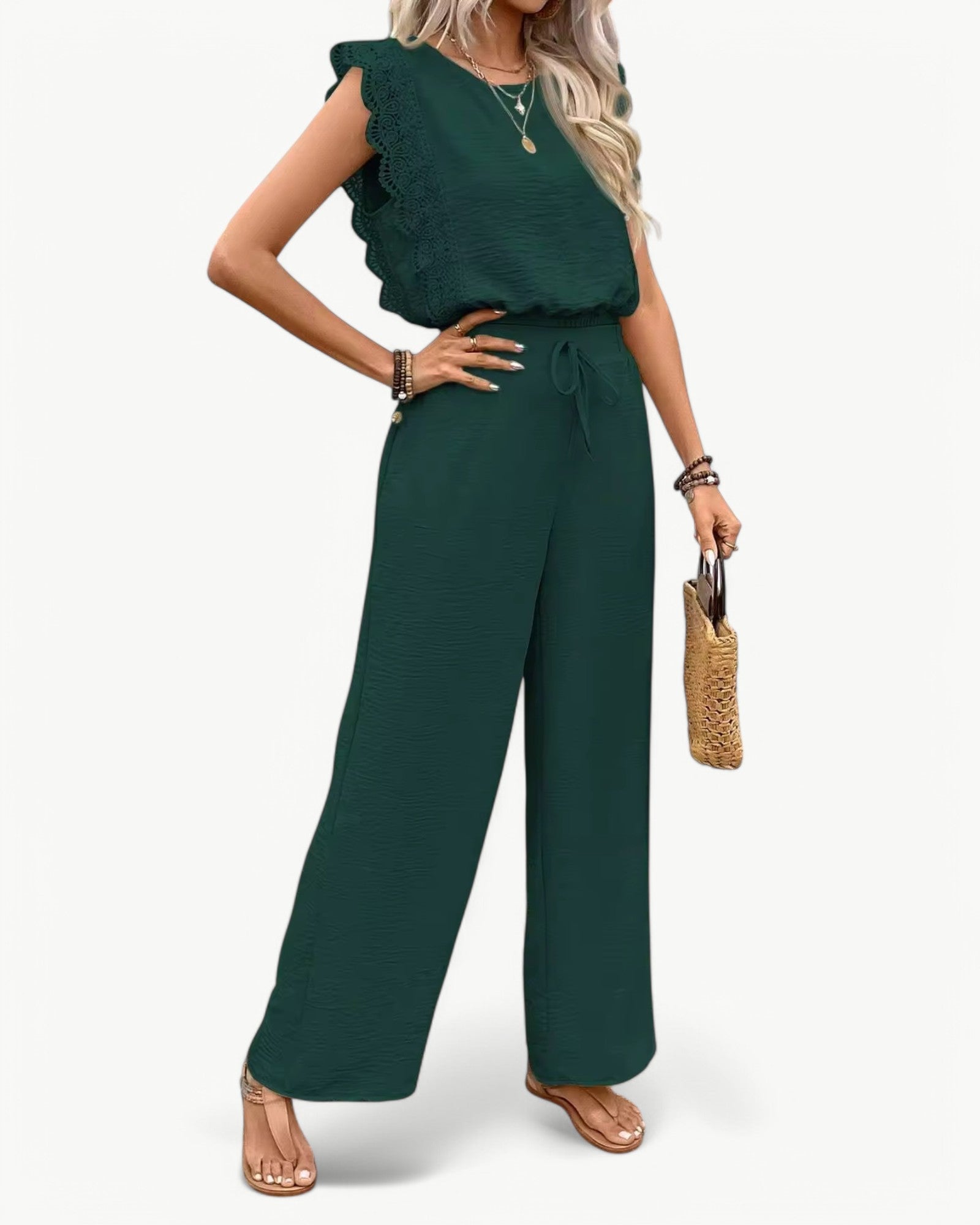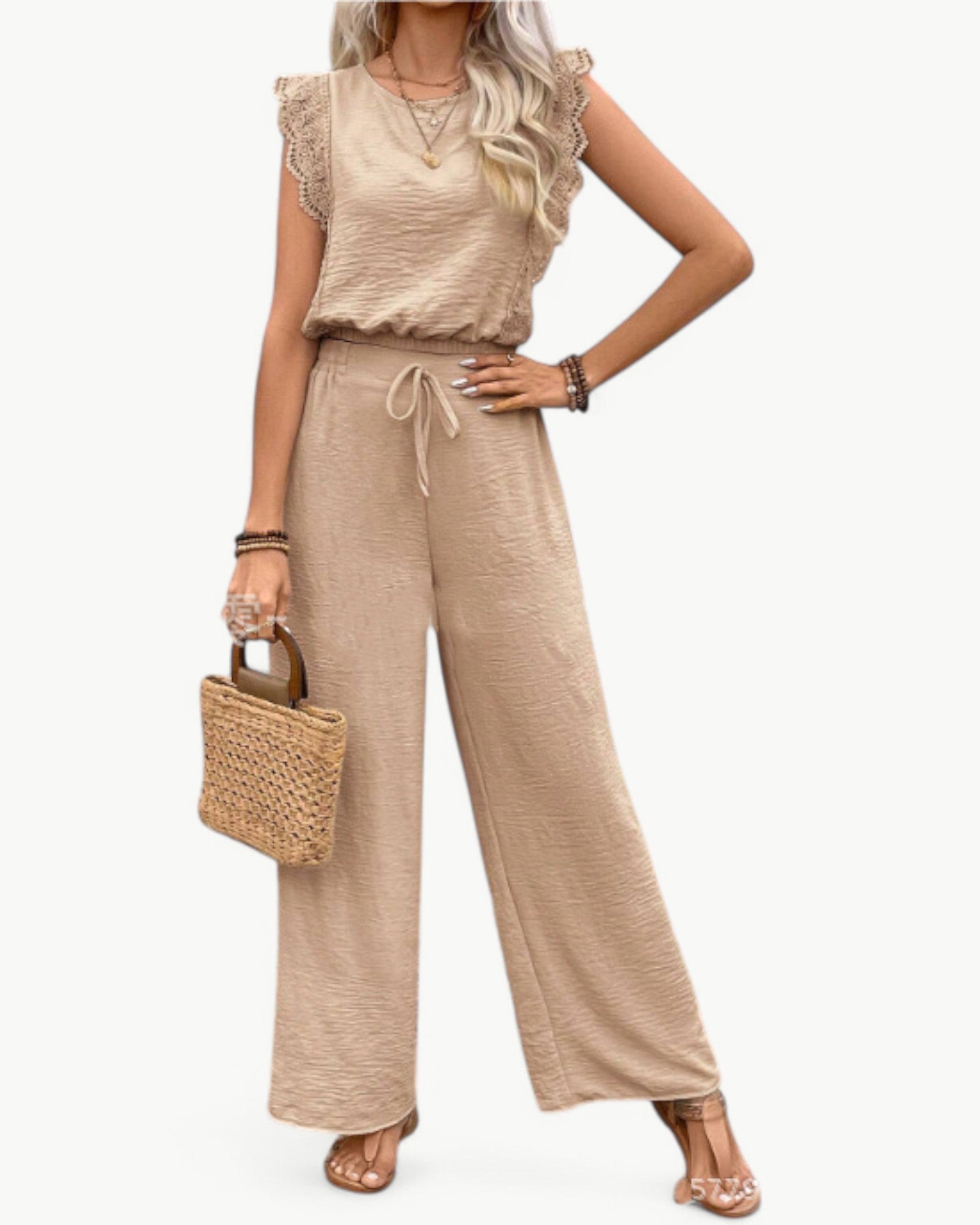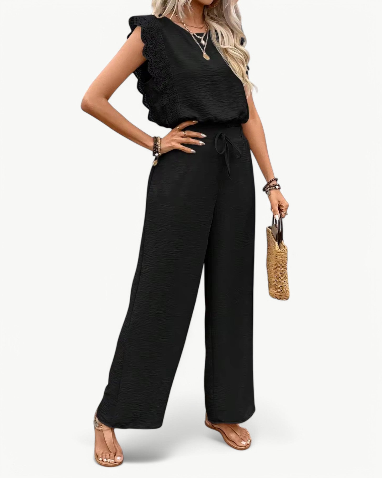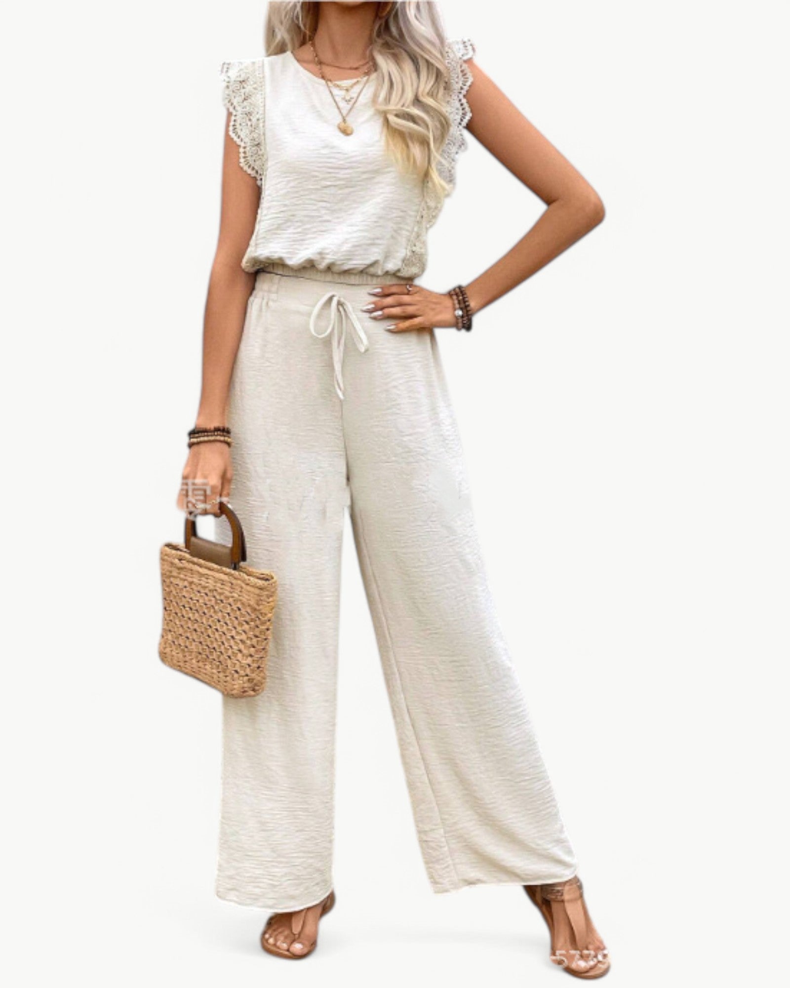 Elegancki 2-częściowy zestaw z bezrękawną bluzką z dekoracyjnymi koronkowymi detalami oraz szerokimi spodniami z paskiem w talii. Lekki, wygodny i idealny na ciepłe dni. Dostępny w kilku różnych kolorach.
