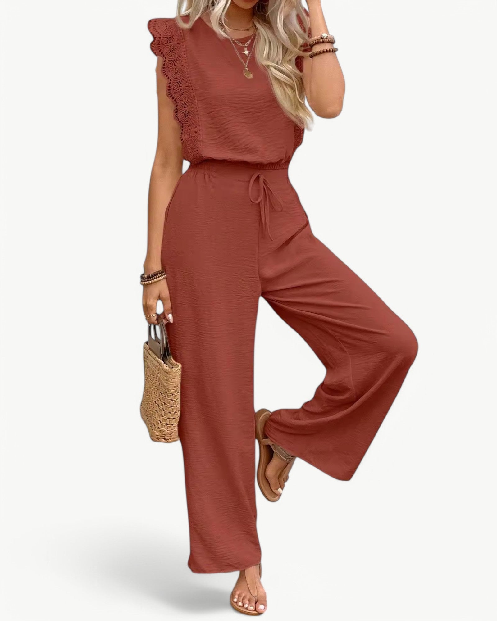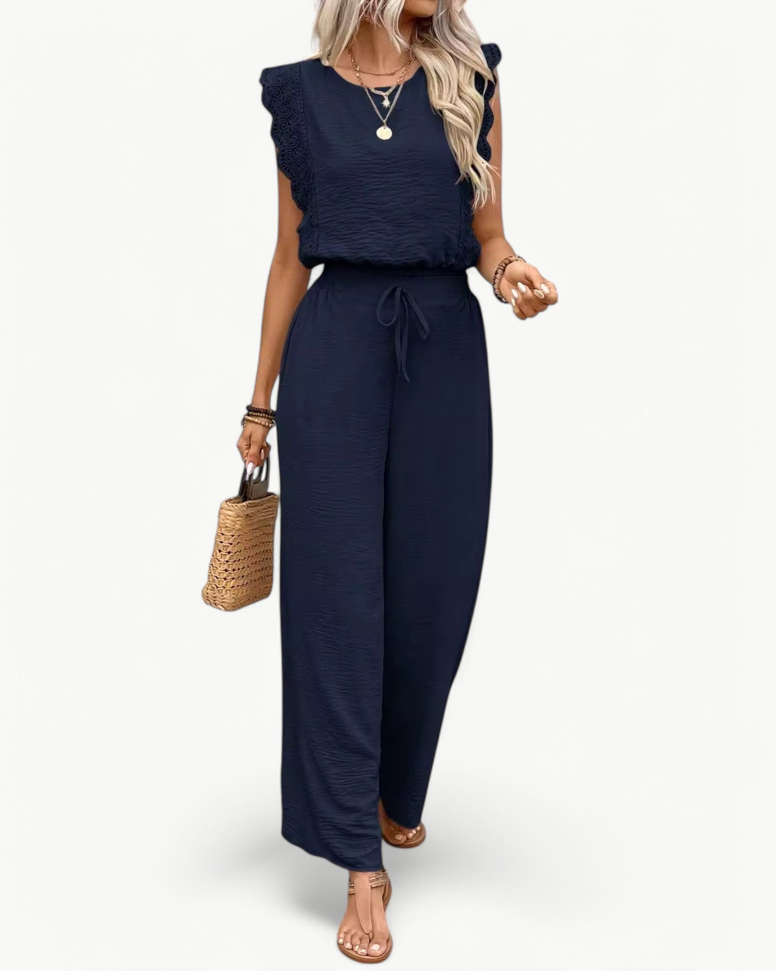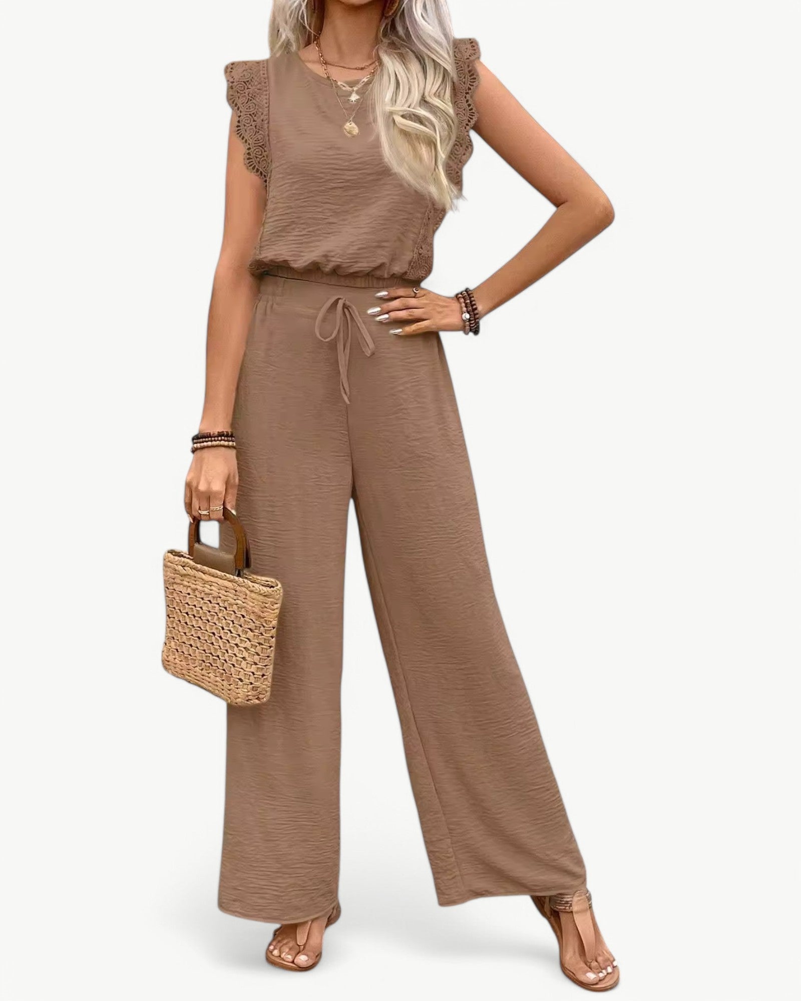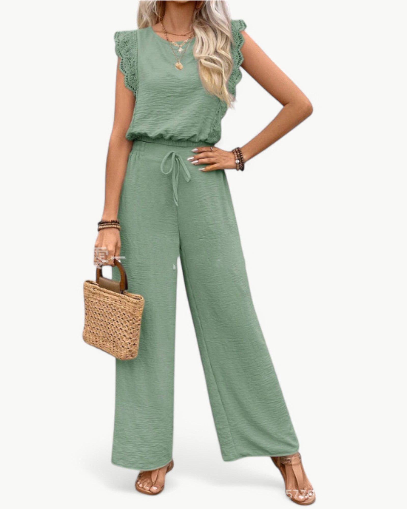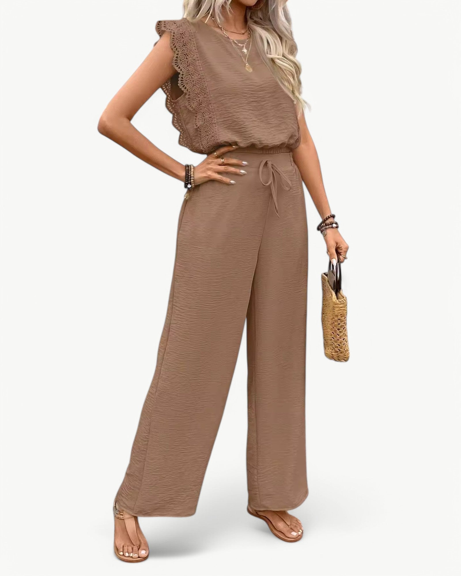 Elegancki 2-częściowy zestaw z bezrękawną bluzką z dekoracyjnymi koronkowymi detalami oraz szerokimi spodniami z paskiem w talii. Lekki, wygodny i idealny na ciepłe dni. Dostępny w kilku różnych kolorach.