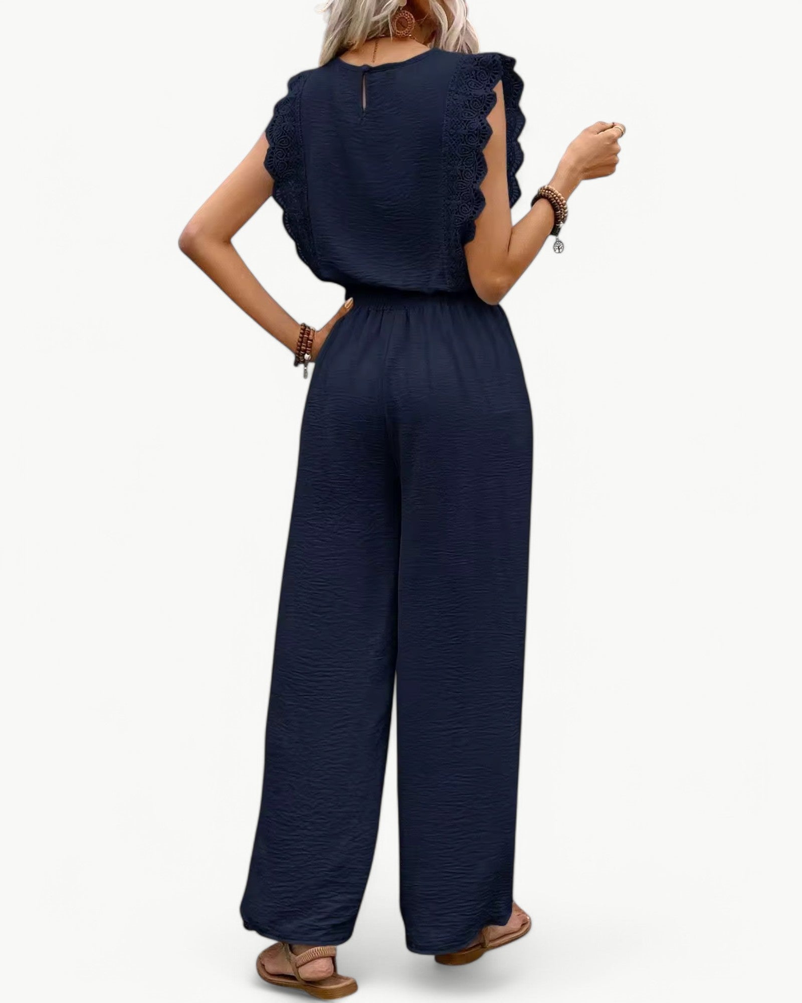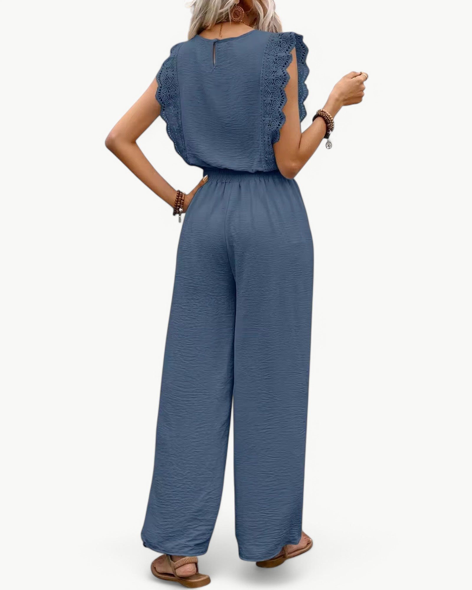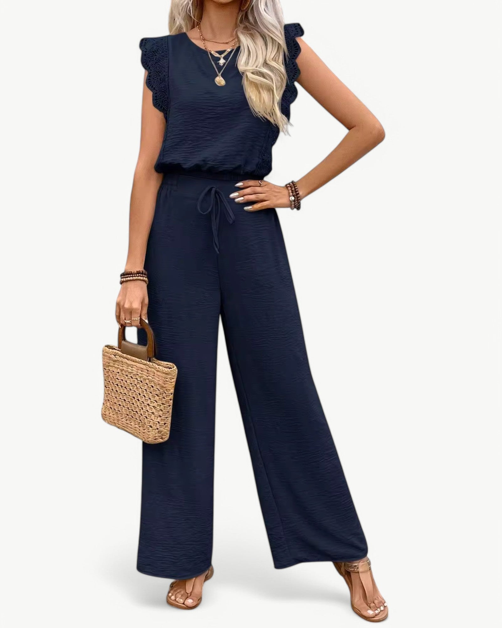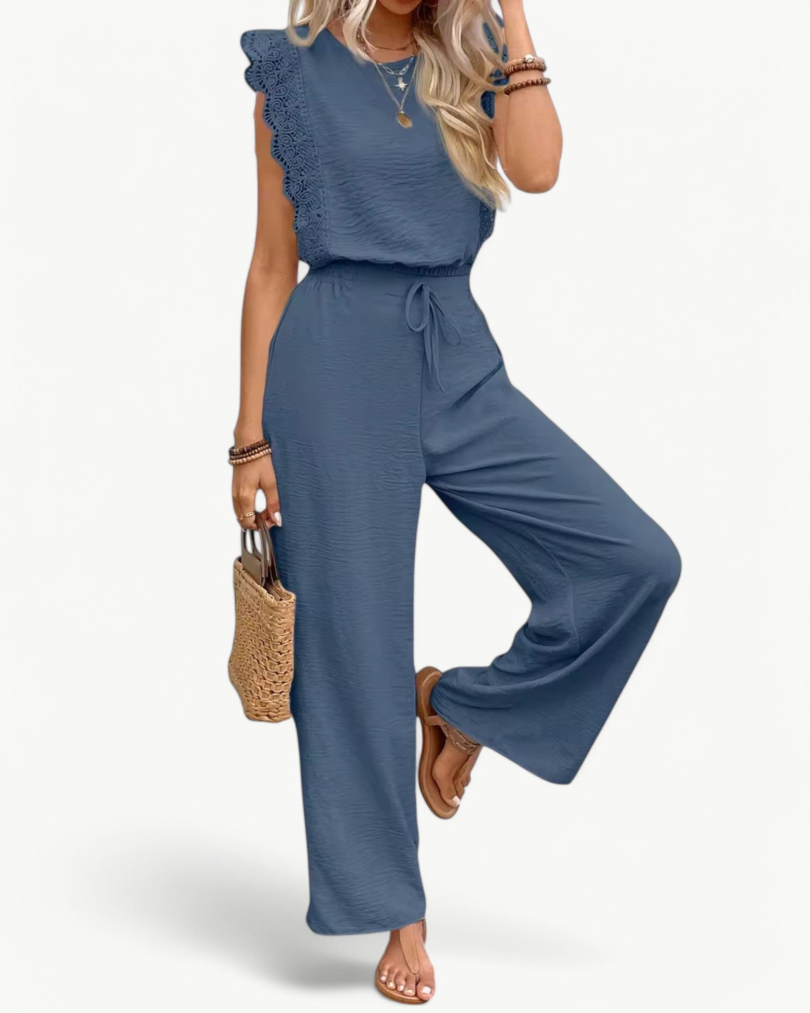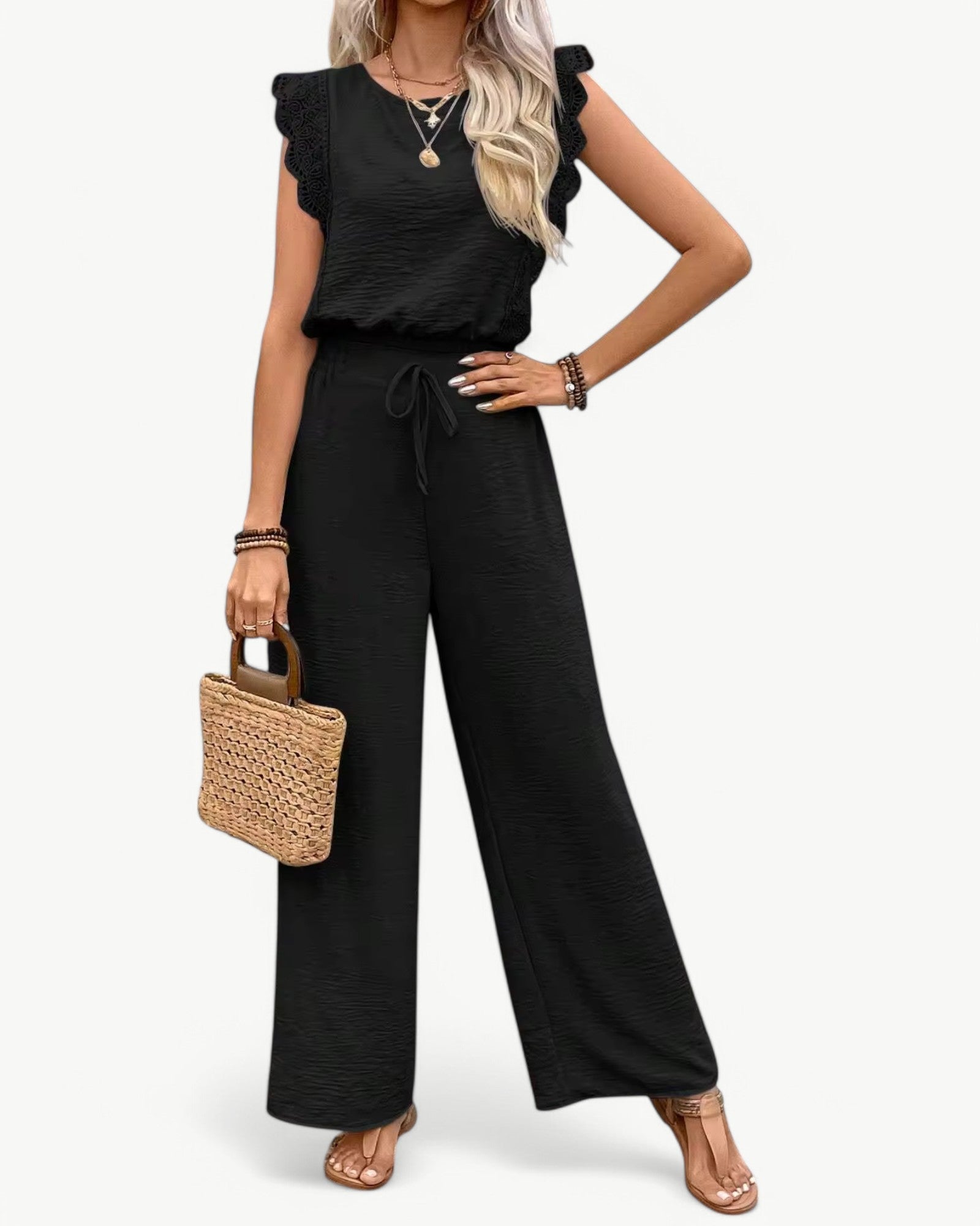 Elegancki 2-częściowy zestaw z bezrękawną bluzką z dekoracyjnymi koronkowymi detalami oraz szerokimi spodniami z paskiem w talii. Lekki, wygodny i idealny na ciepłe dni. Dostępny w kilku różnych kolorach.