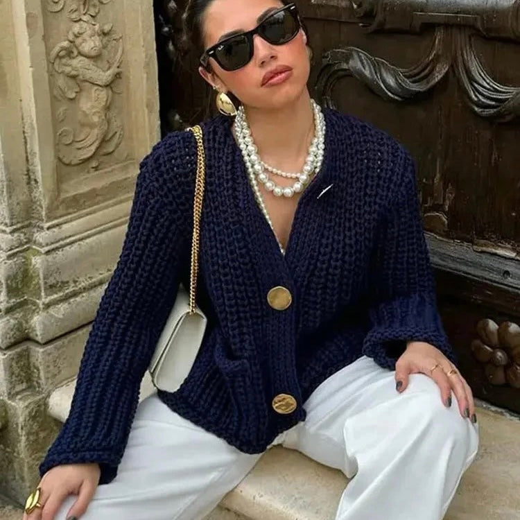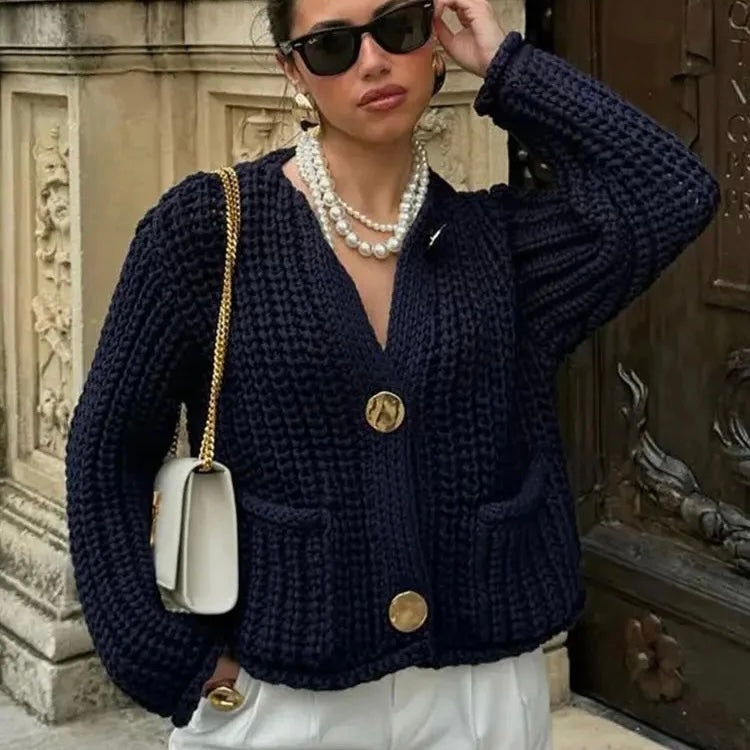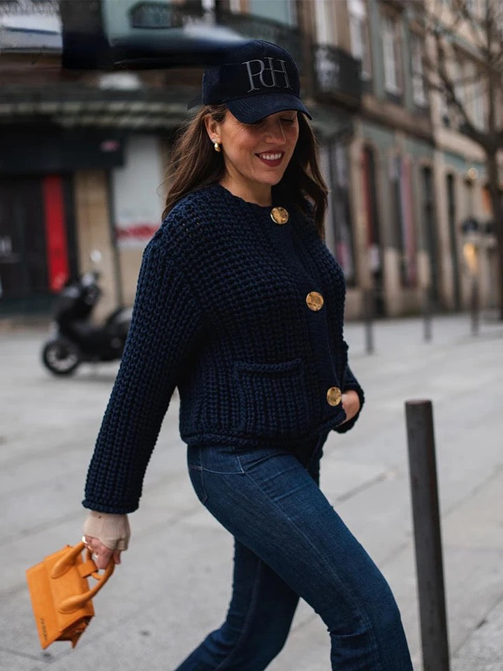 To ciepły kardigan, który oferuje idealną równowagę między stylem a funkcjonalnością. Gruba dzianina nadaje wyraźną teksturę, podczas gdy większe złote guziki podkreślają poczucie wyrafinowania i luksusu.