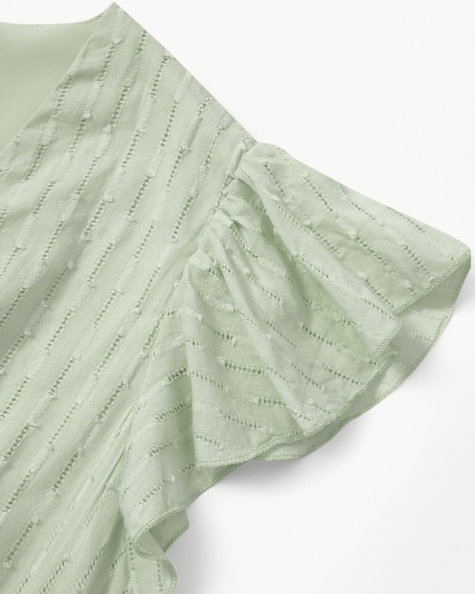 Elegancka sukienka midi z dekoltem w kształcie litery V, krótkimi falbanami i podkreśloną talią. Cienka struktura nadaje ubraniu ekskluzywny wygląd, a elastyczny krój sprawia, że jest łatwa do noszenia przez cały dzień.