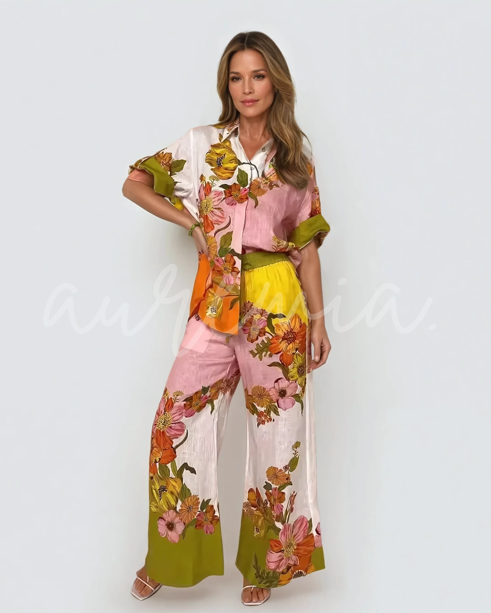 Koszula i spodnie z przewiewnej mieszanki lnu w pięknym kwiatowym wzorze z kolekcji SUNRISE BLOOM. Sprzedawane osobno – piękne osobno, ale razem tworzą letni wymarzony look.