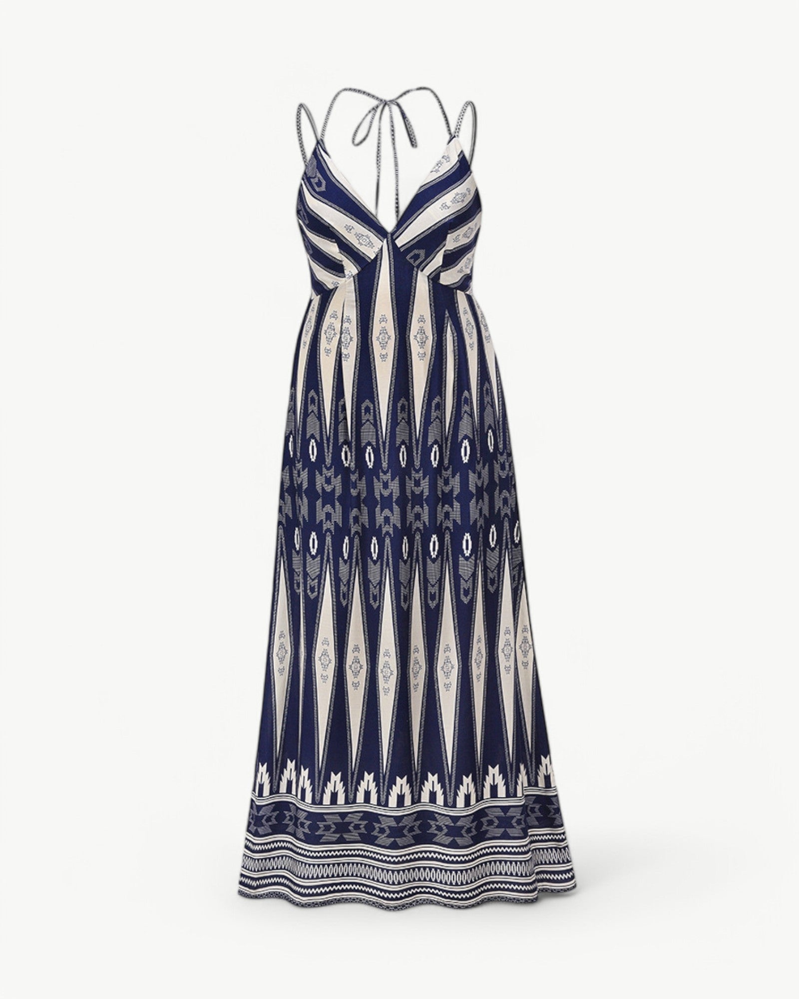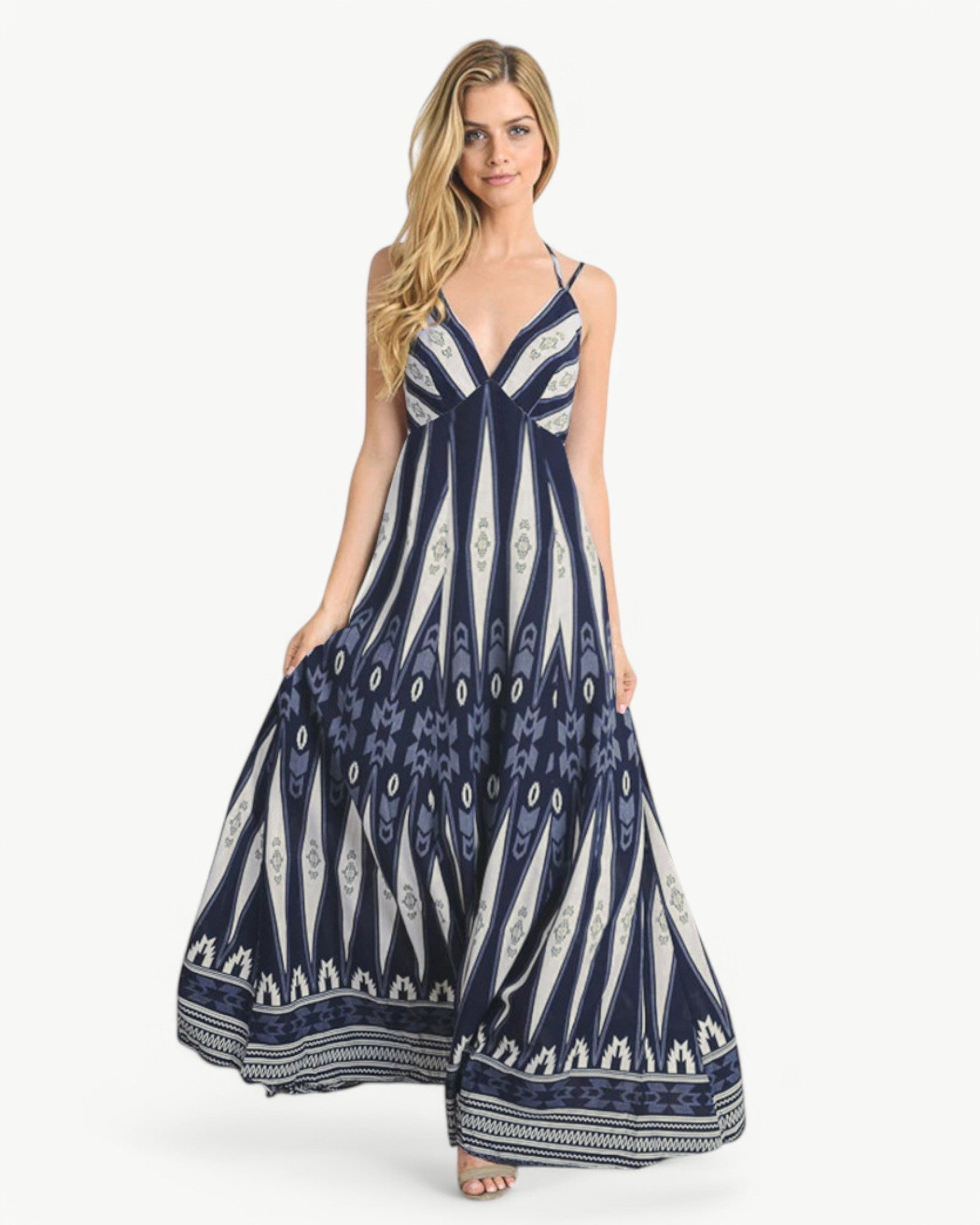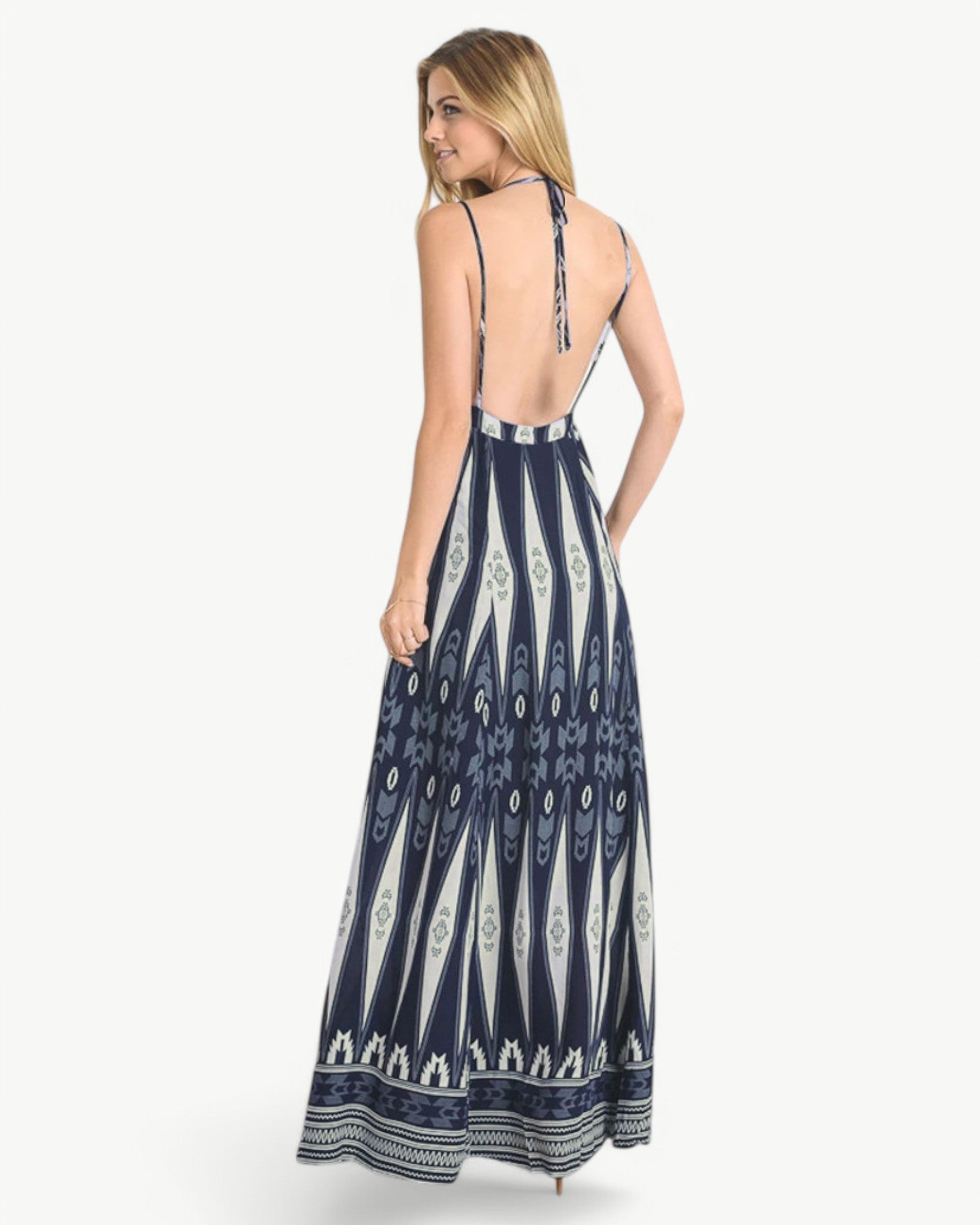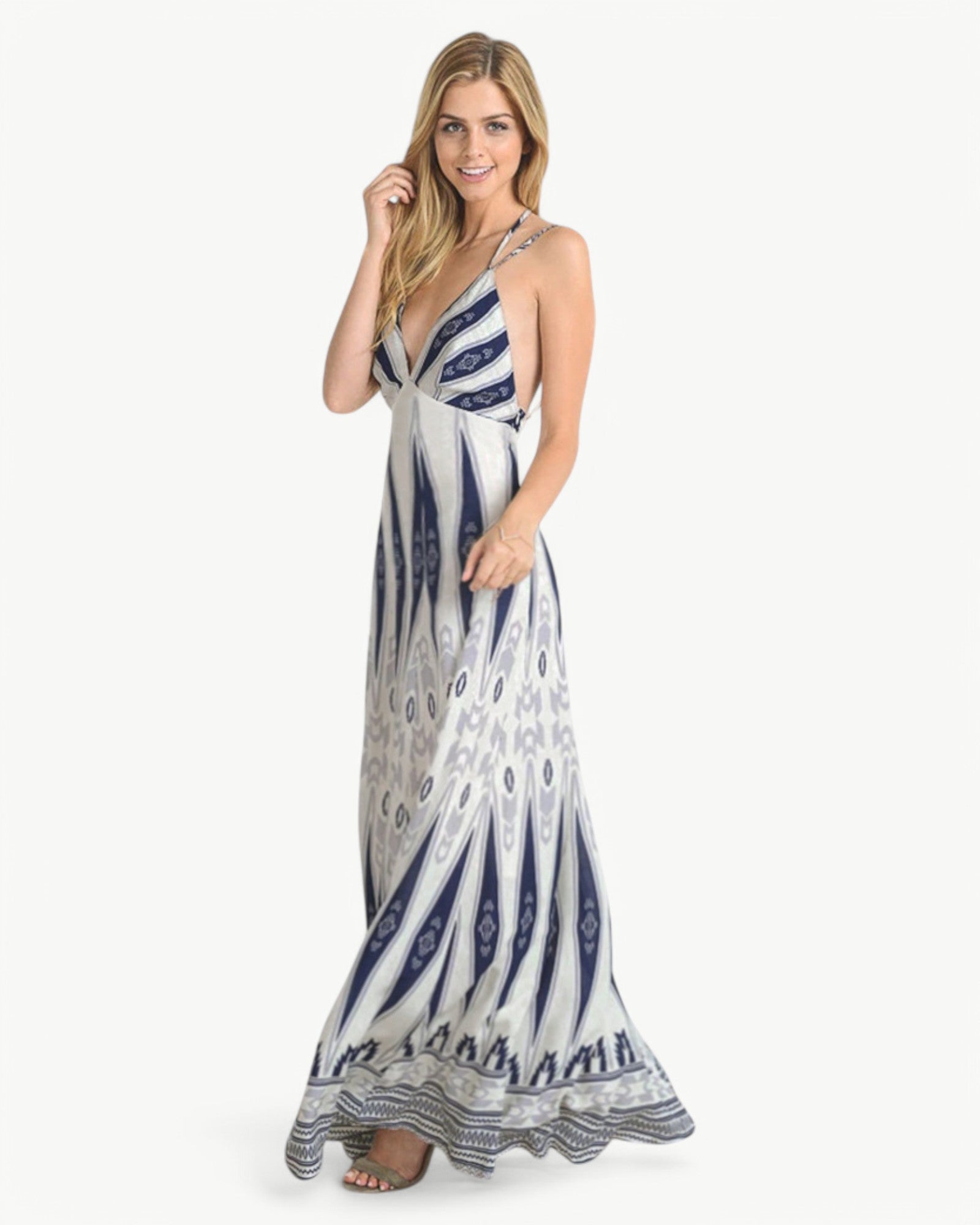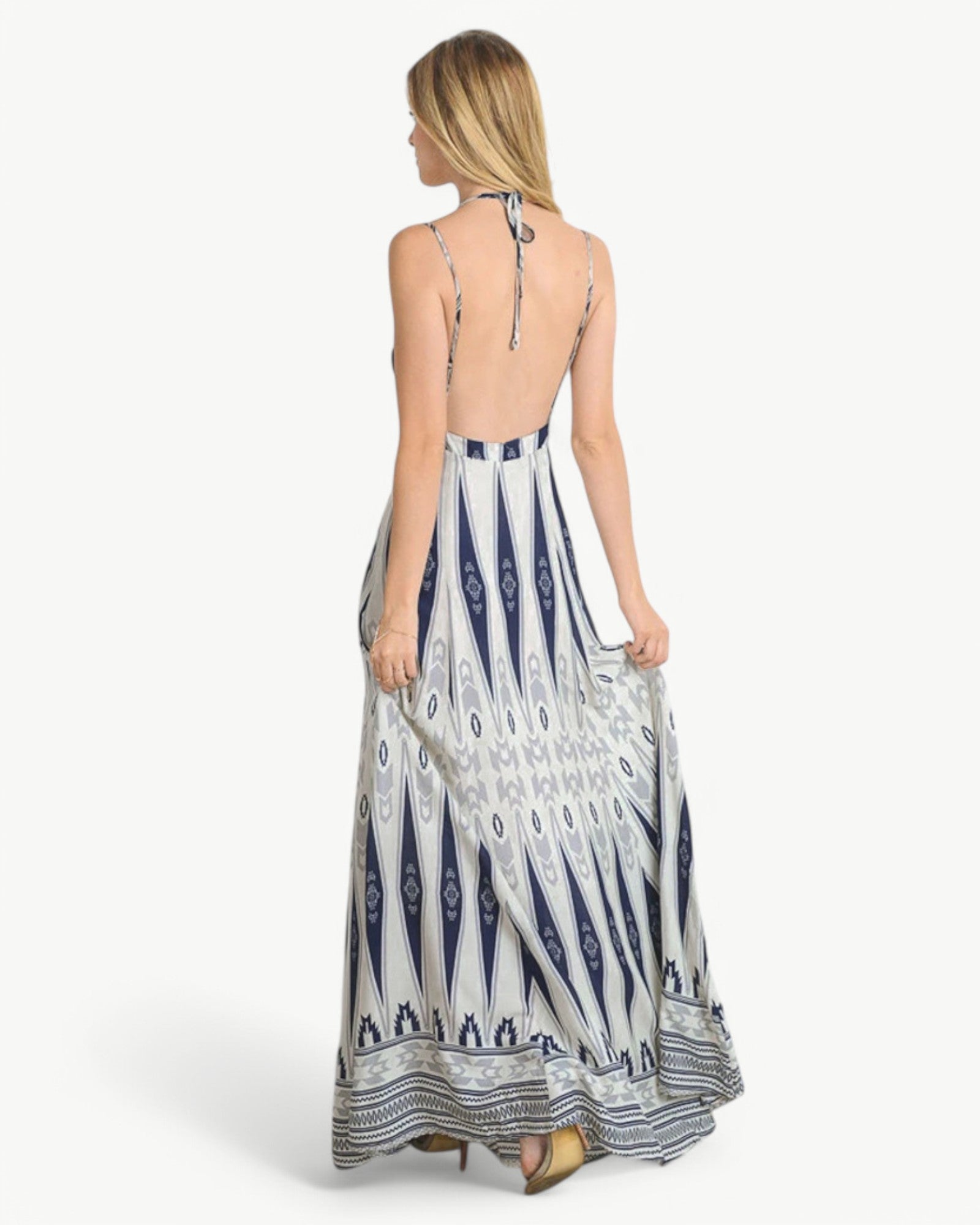 Długa, bezrękawnikowa sukienka maxi z pięknym wzorem, dekoltem w serek i odkrytymi plecami. Kobieca i lekka modelka, idealna na ciepłe letnie dni i okazje.