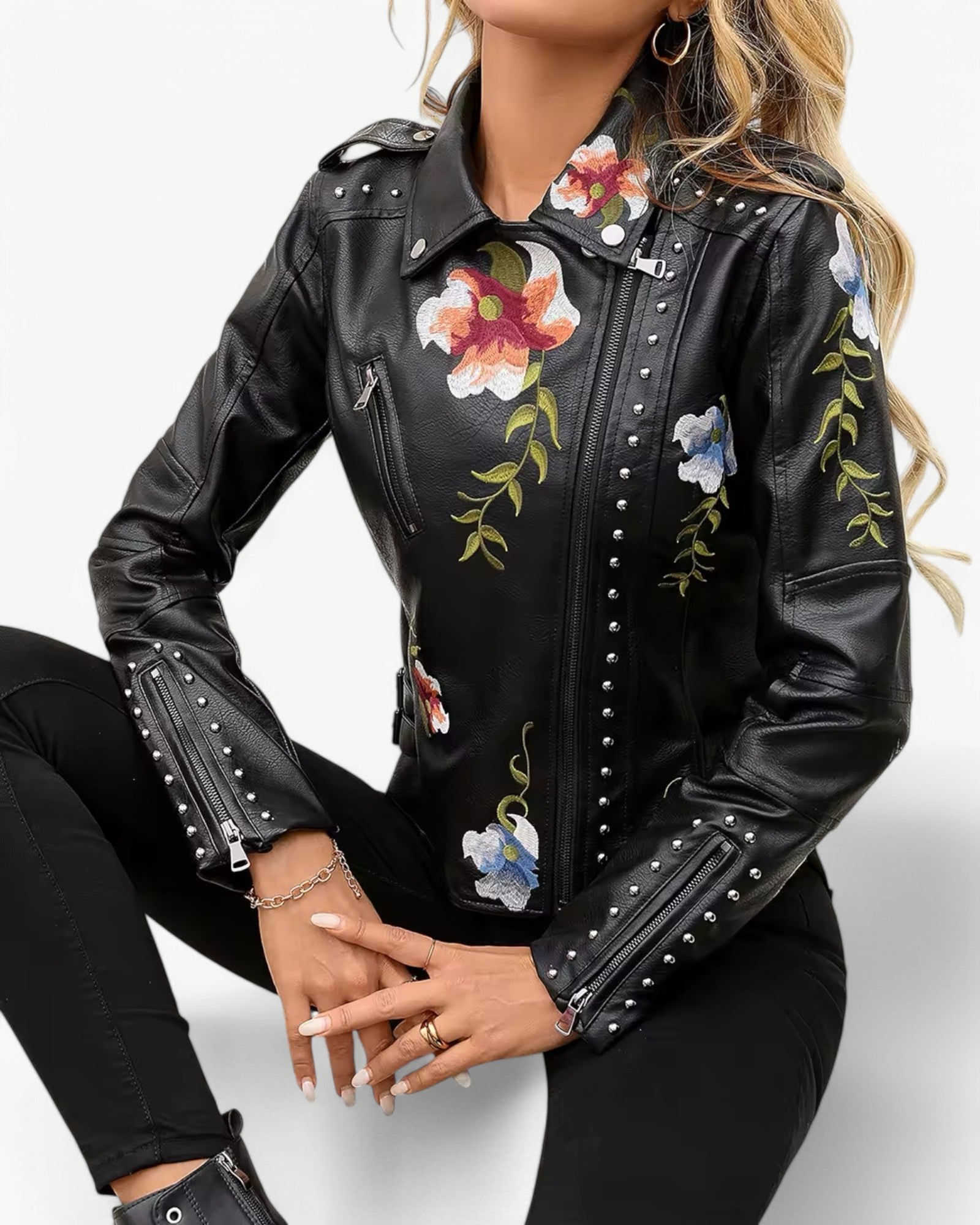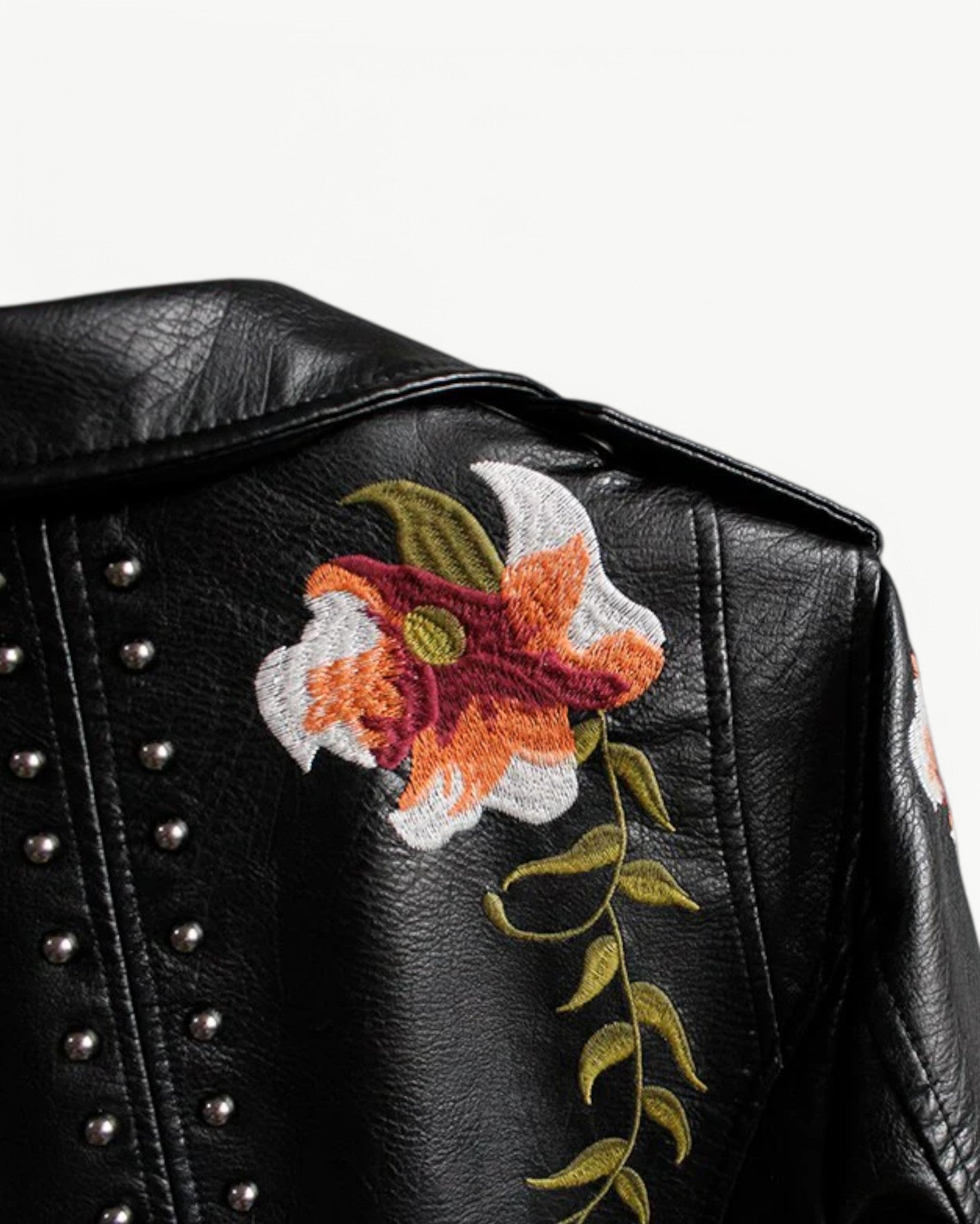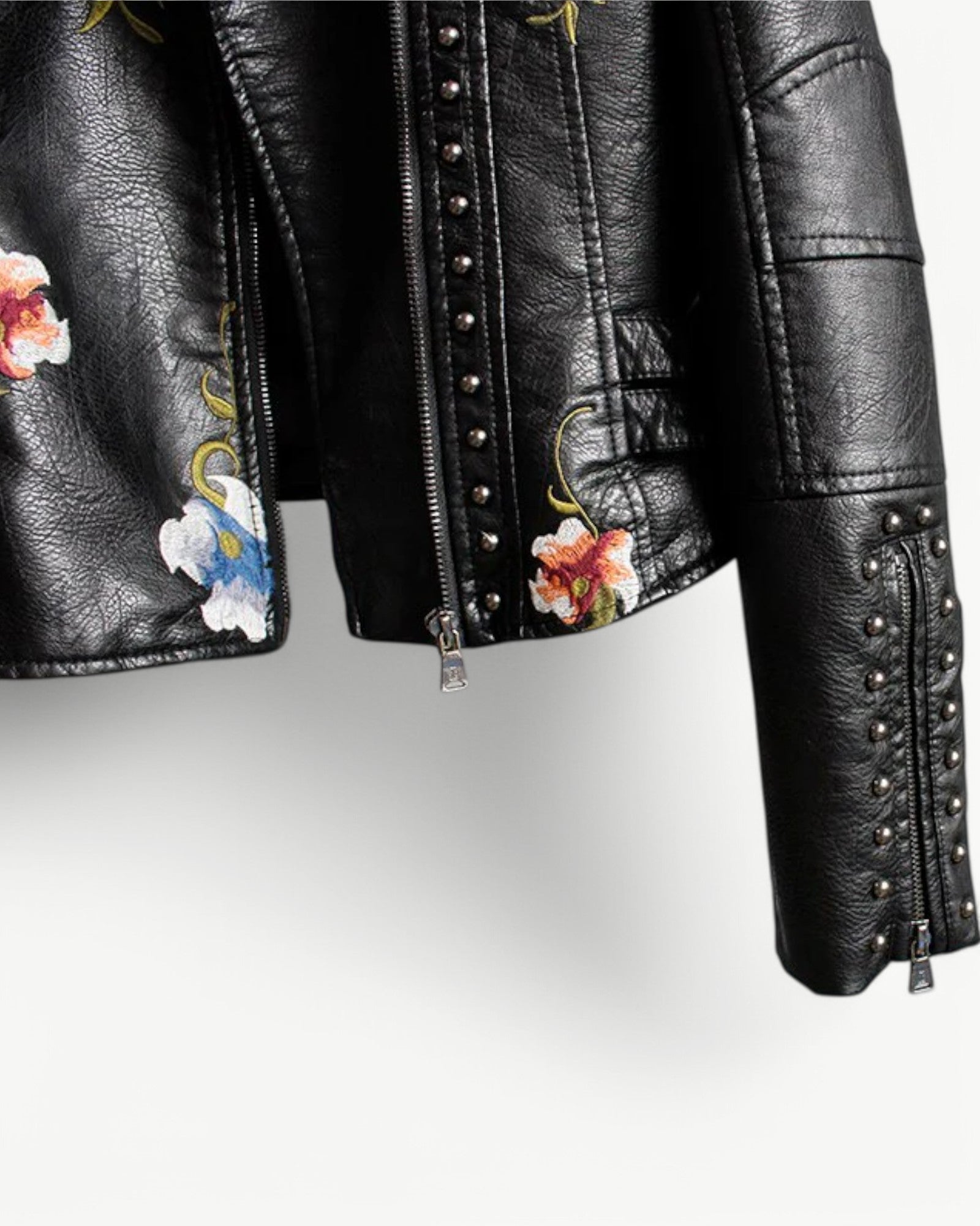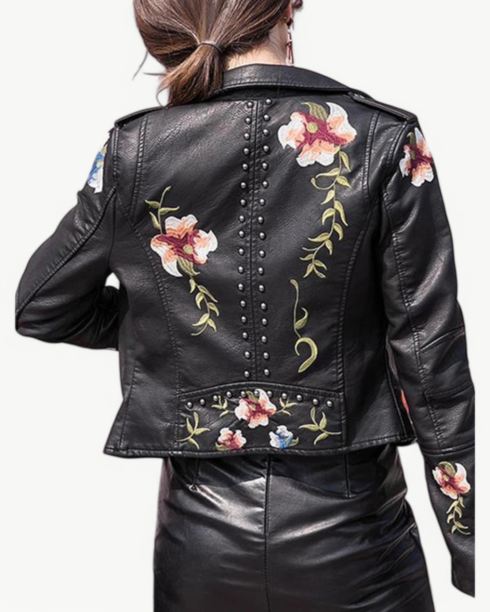 Elegancka kurtka skórzana z kwiatowym haftem i ćwiekami