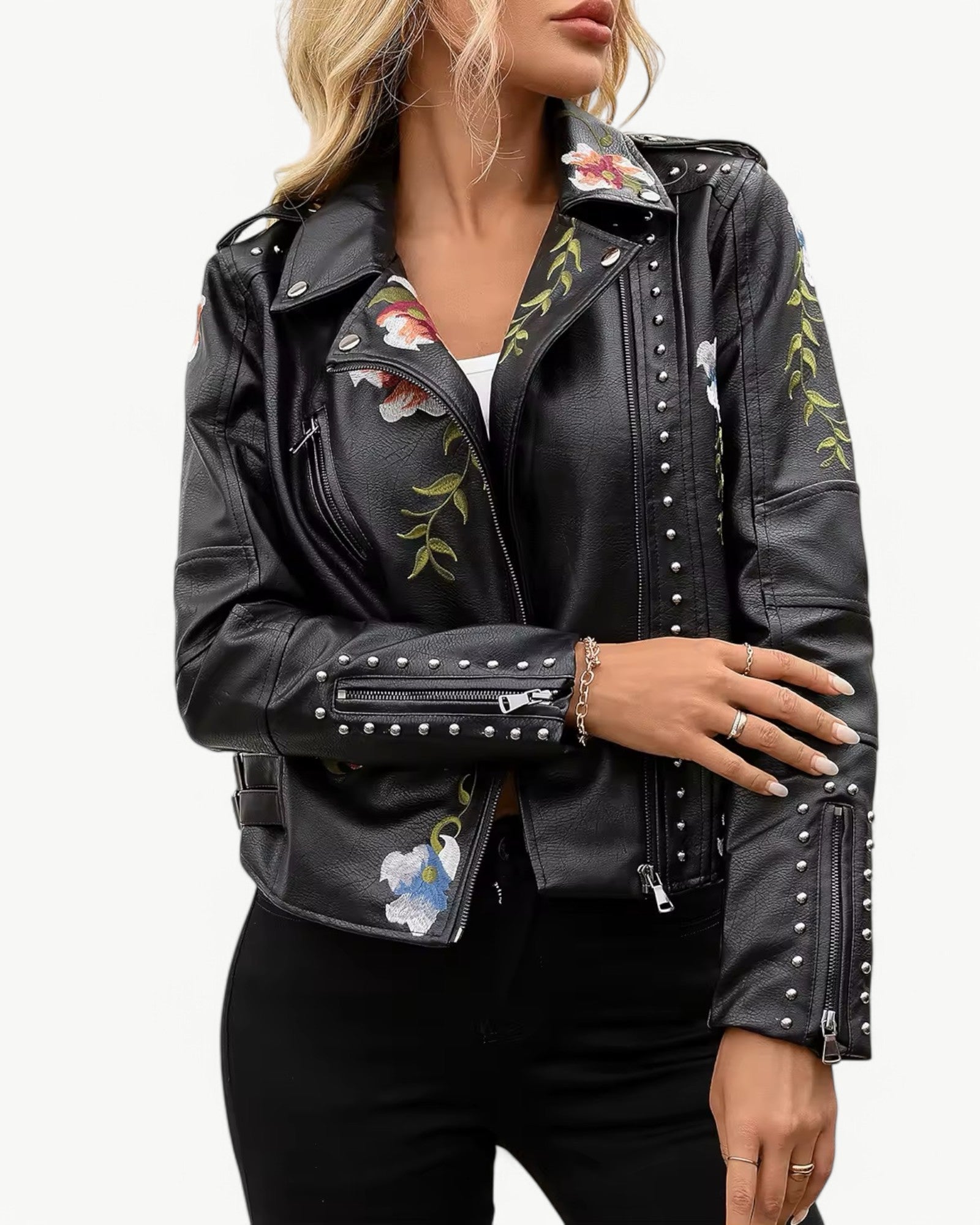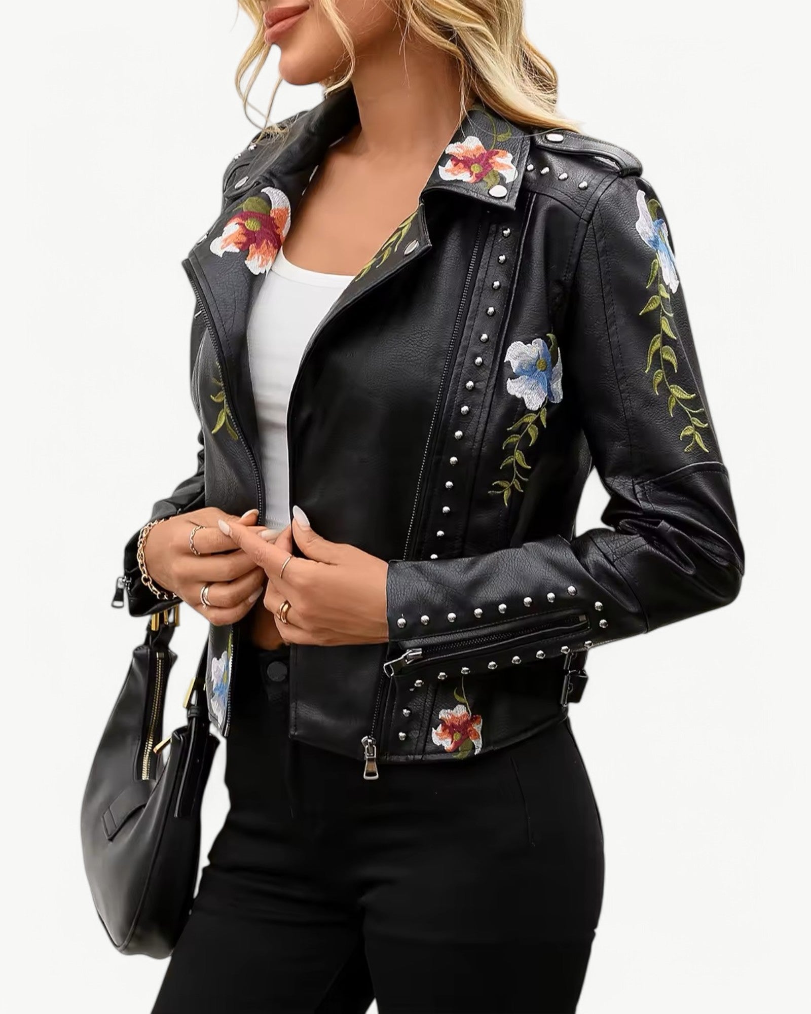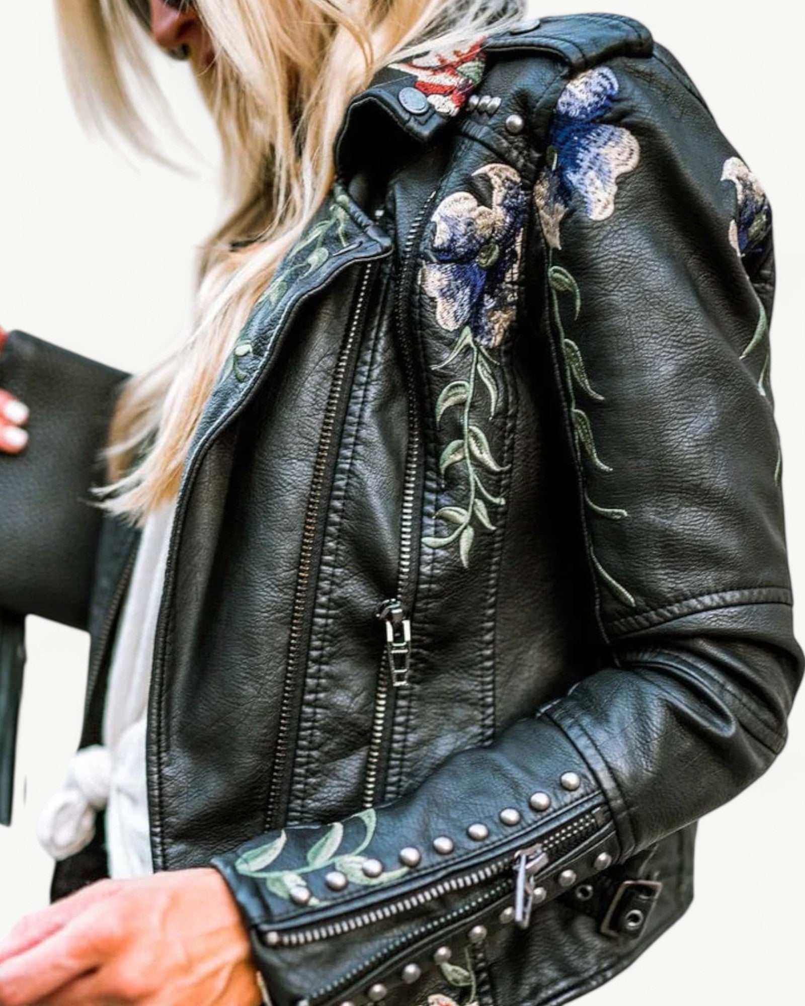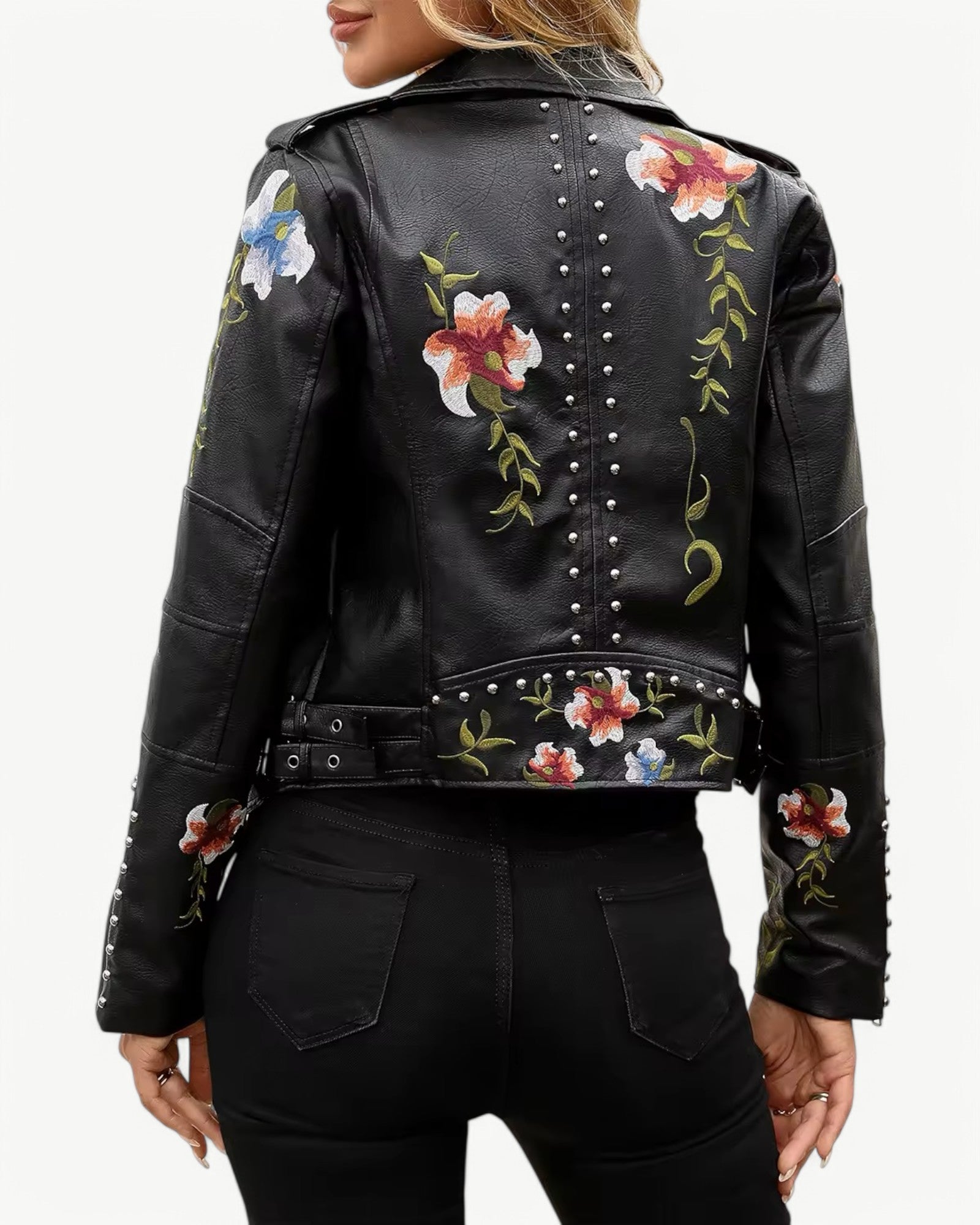 Elegancka kurtka skórzana z kwiatowym haftem i ćwiekami
