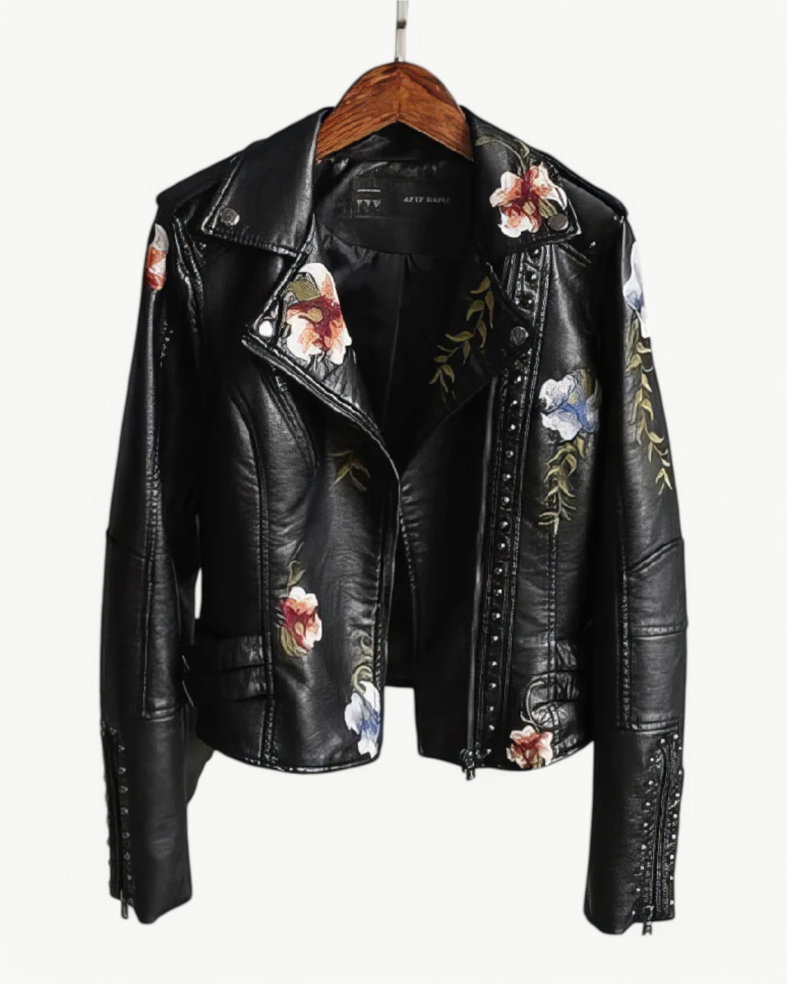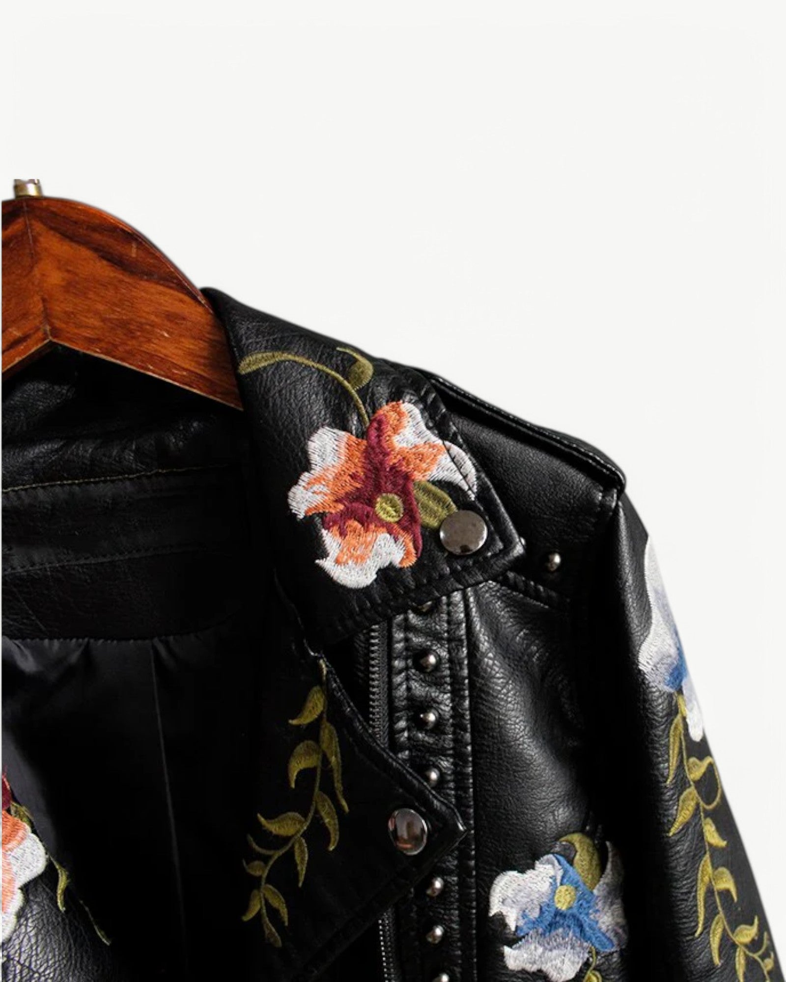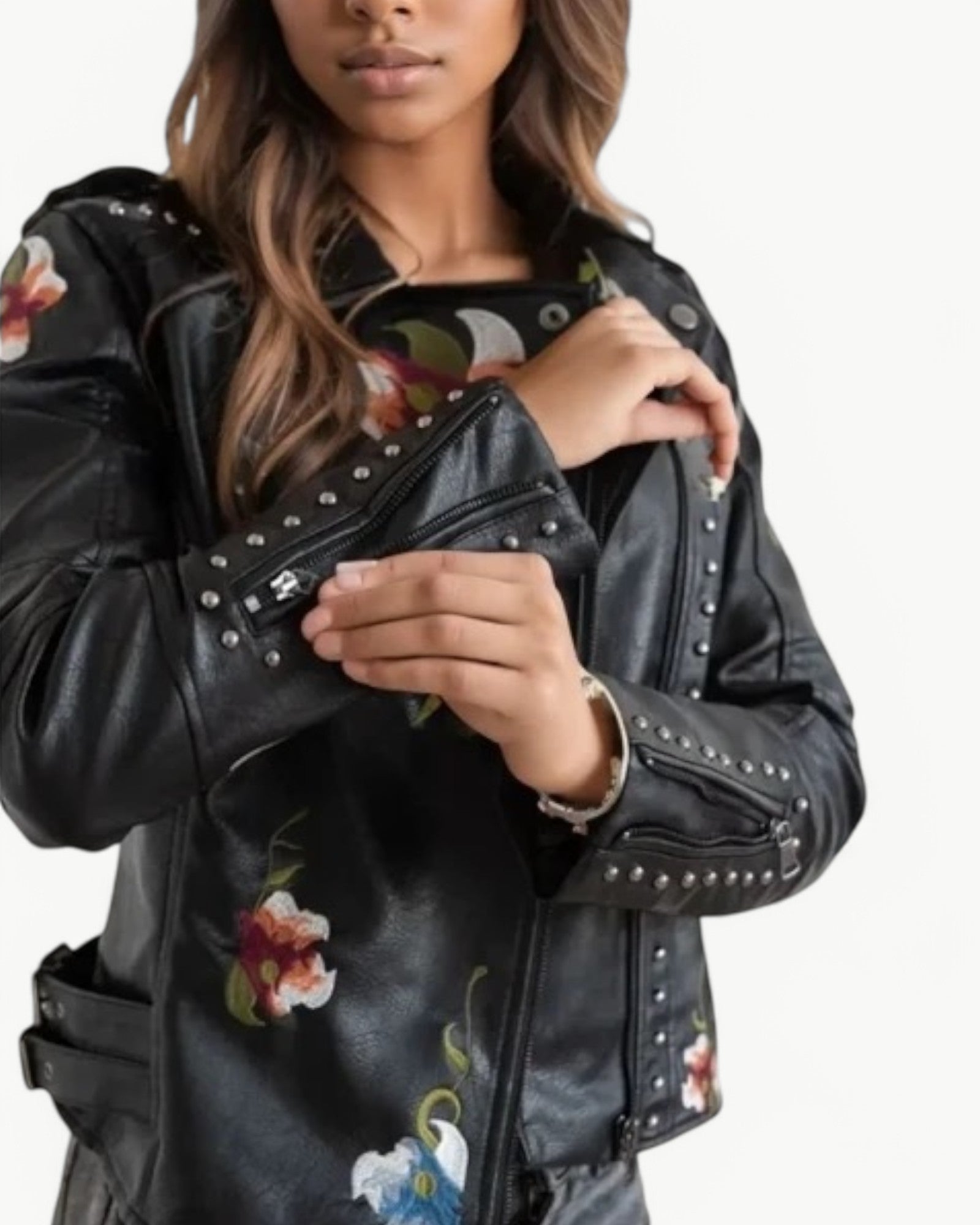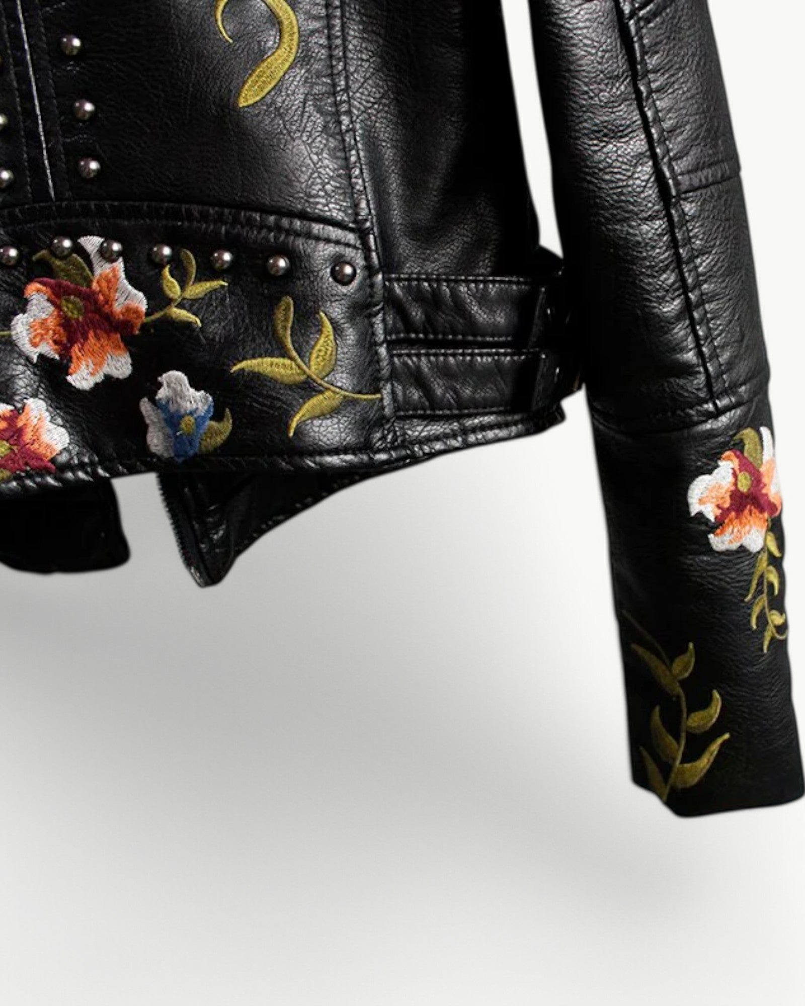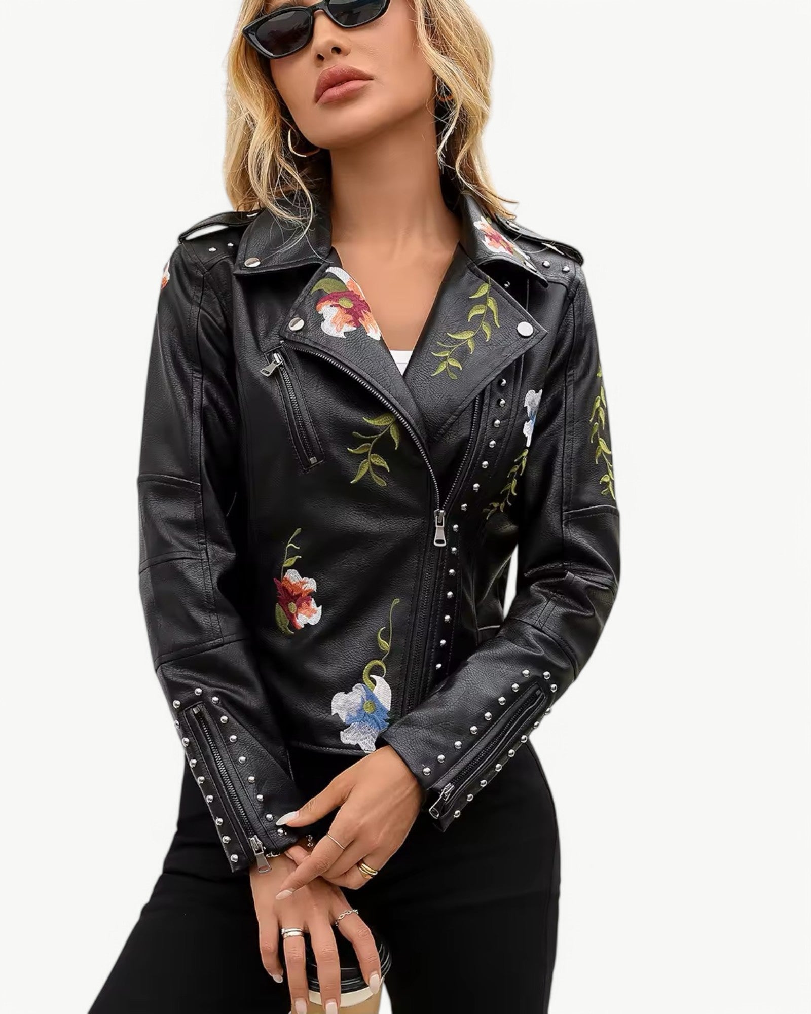 Elegancka kurtka skórzana z kwiatowym haftem i ćwiekami