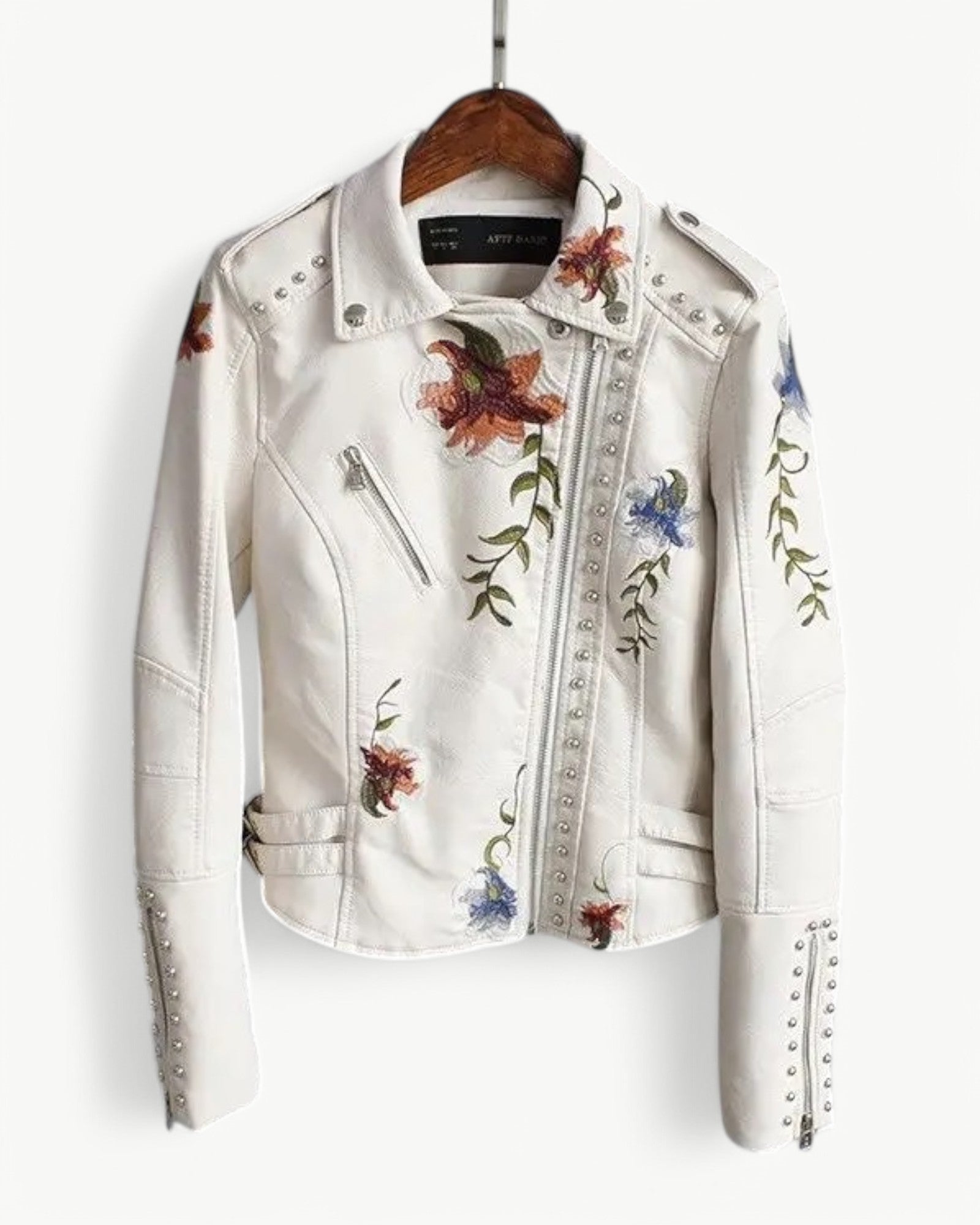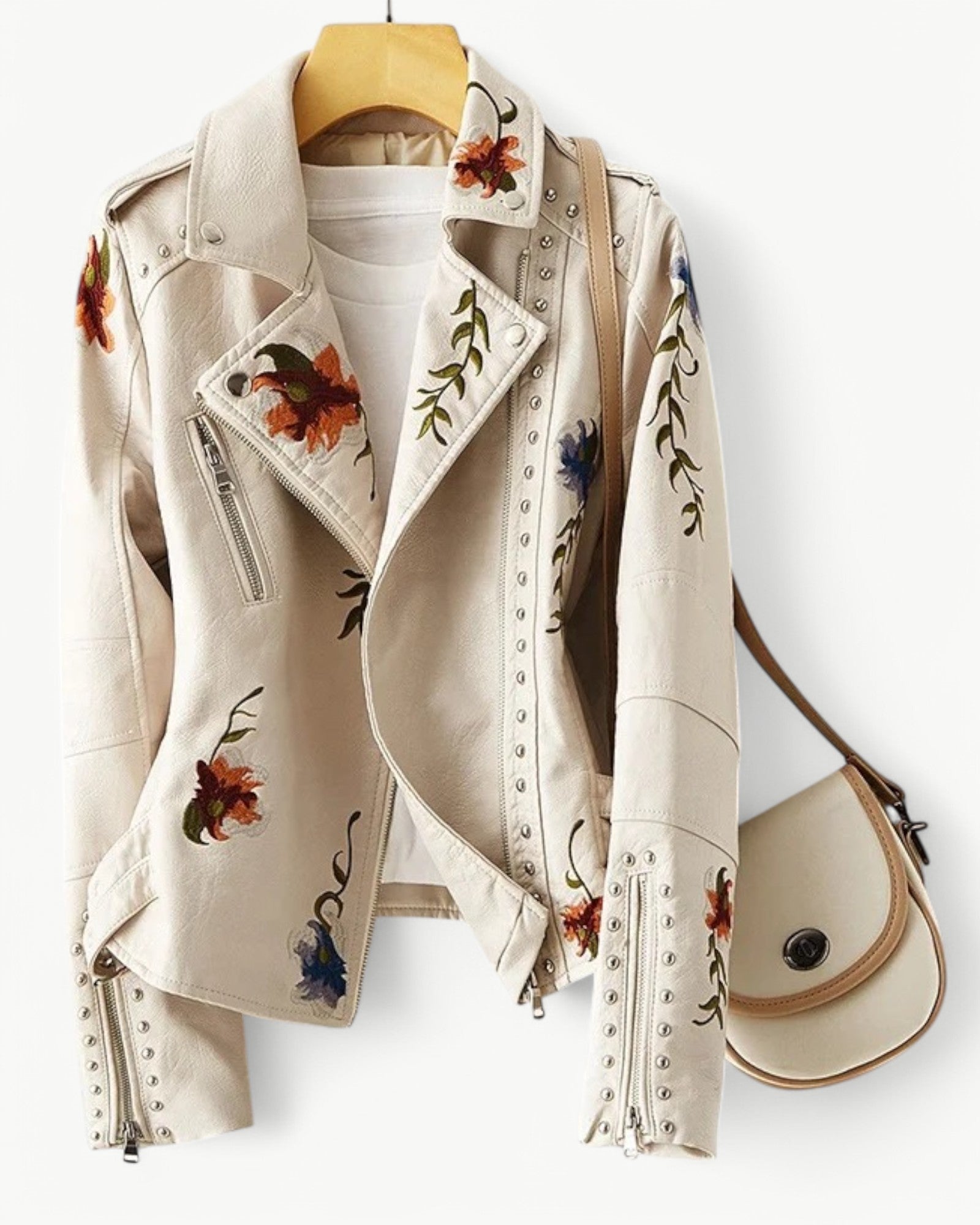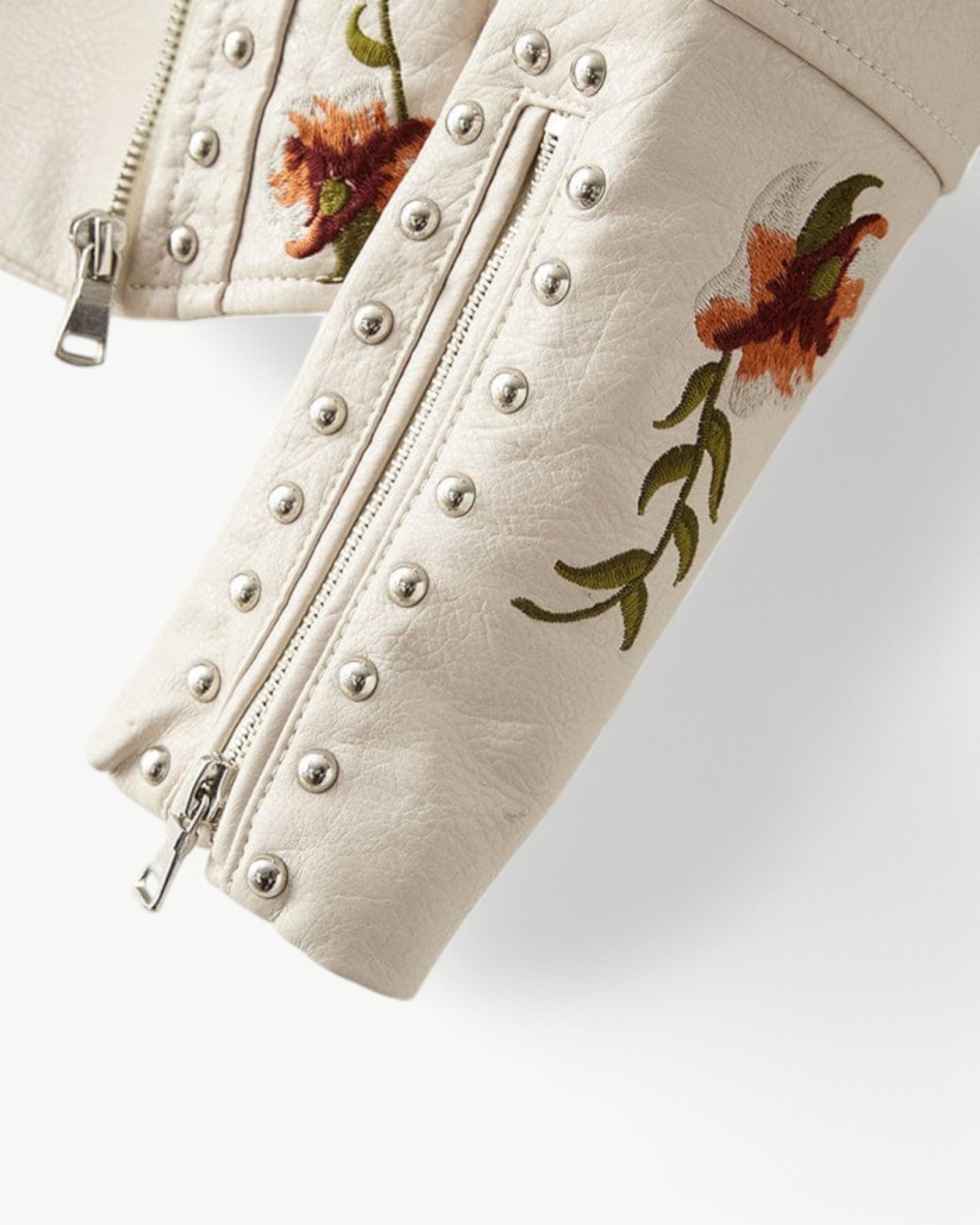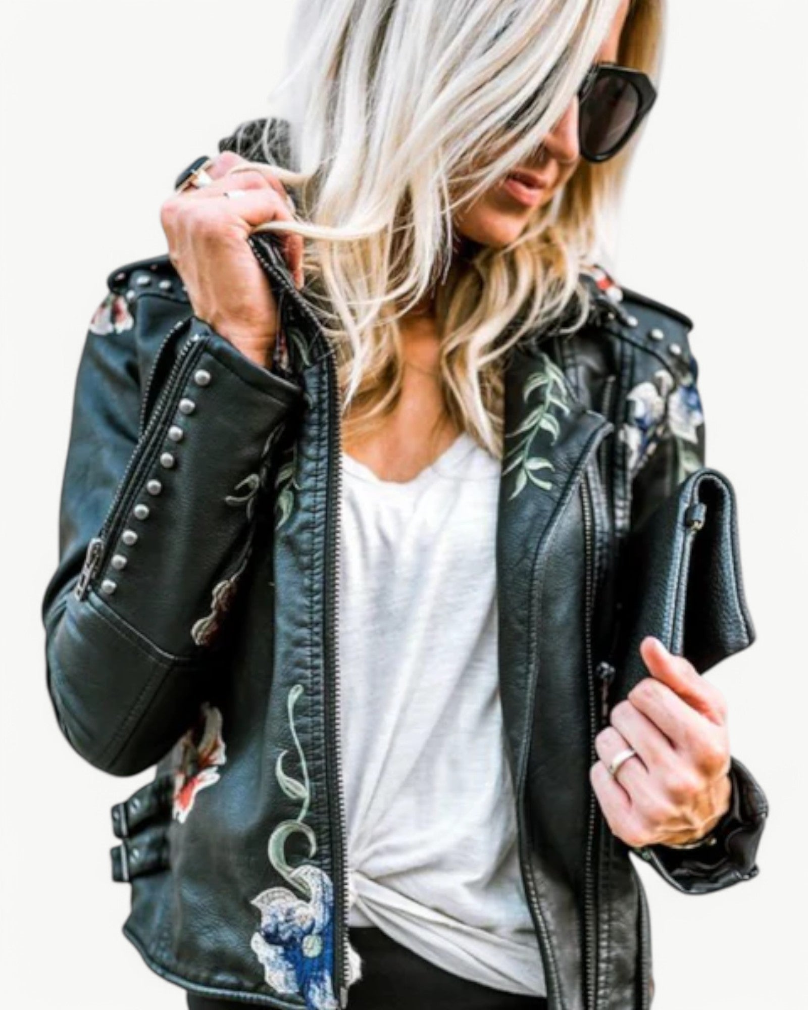 Elegancka kurtka skórzana z kwiatowym haftem i ćwiekami