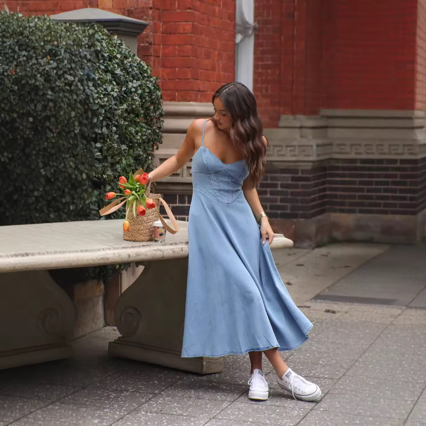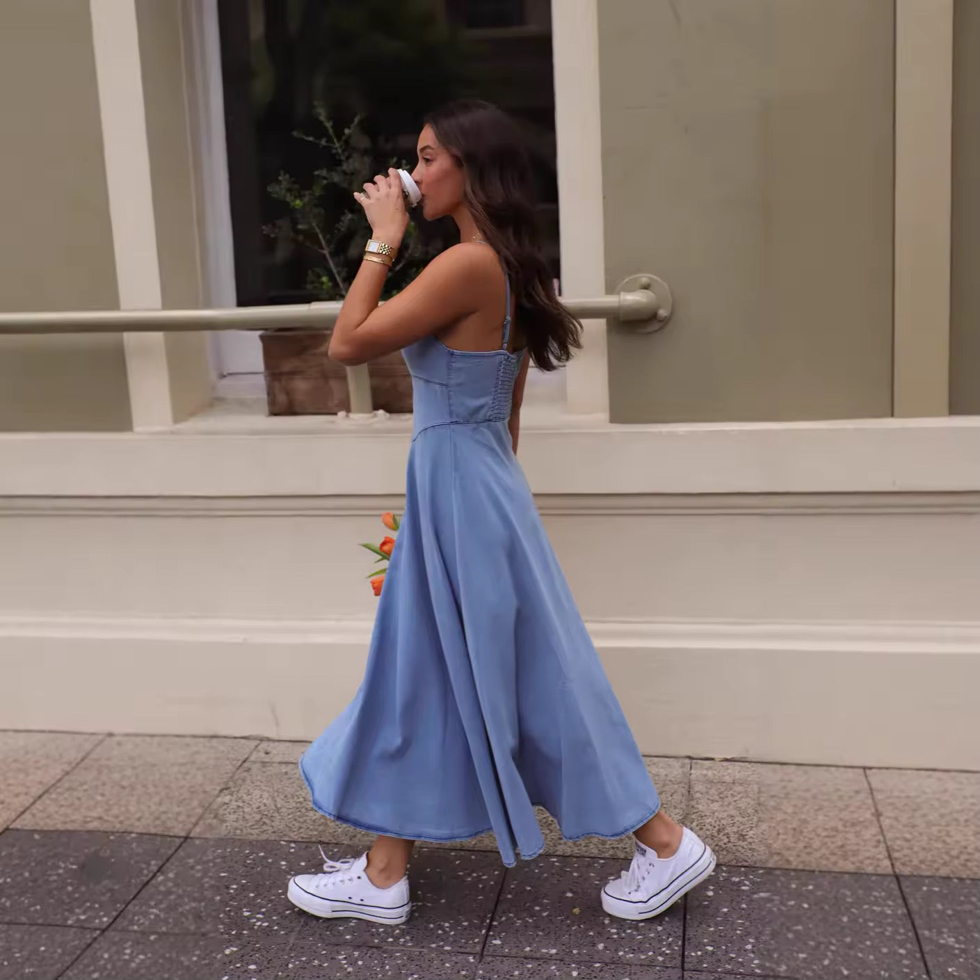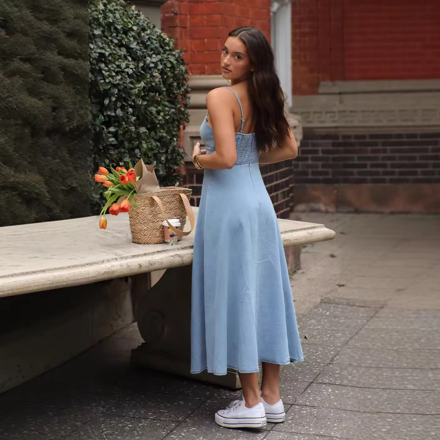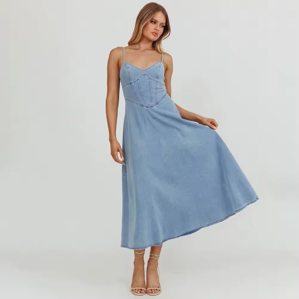 Lekka i elegancka sukienka dżinsowa z miękkiego materiału dżinsowego, z dopasowaną górą i zaznaczoną talią. Sukienka ma wąskie, regulowane ramiączka oraz lekko rozkloszowaną spódnicę, co tworzy swobodny, ale kobiecy wygląd. Gumka z tyłu zapewnia dodatkowy komfort i idealne dopasowanie.