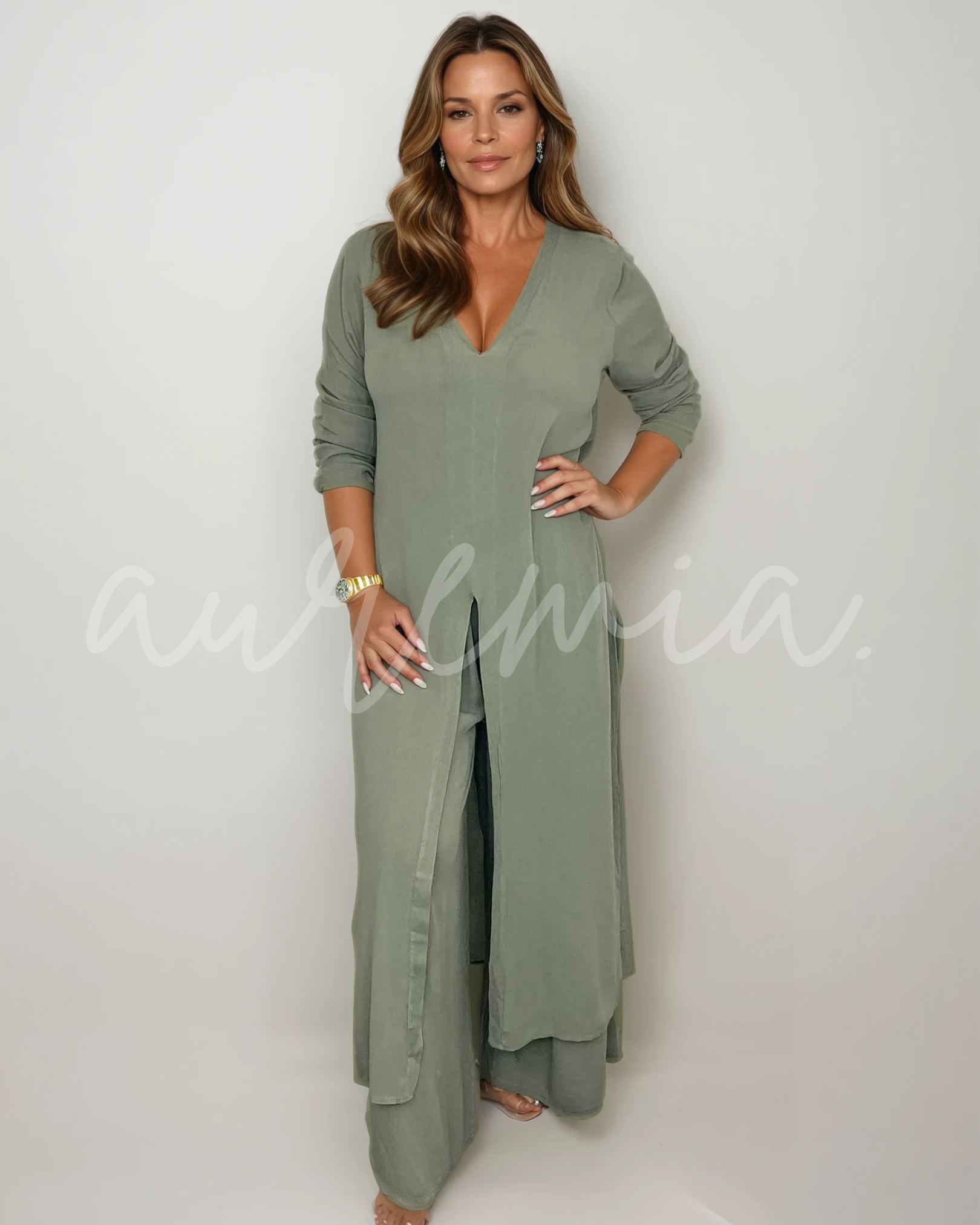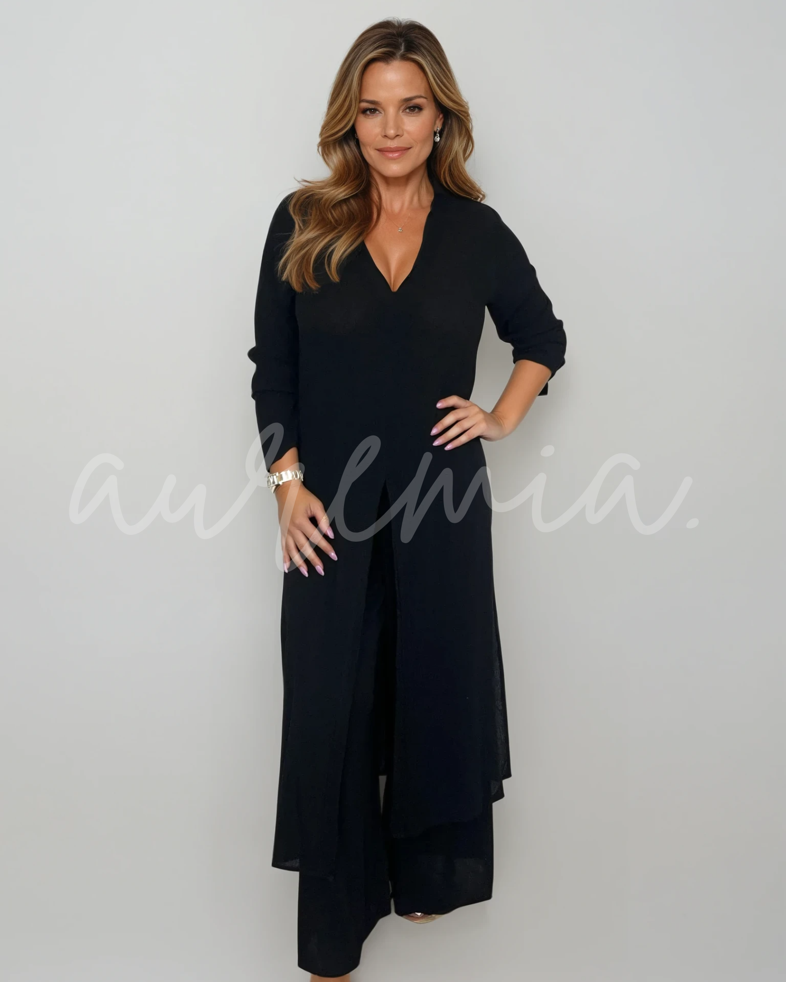 Stylowy i przewiewny zestaw, który łączy nowoczesny design z maksymalnym komfortem. Długa tunika w serek z rozcięciem z przodu oraz dopasowane spodnie z lekkiego materiału, który pięknie układa się na sylwetce – idealny na letnie okazje.