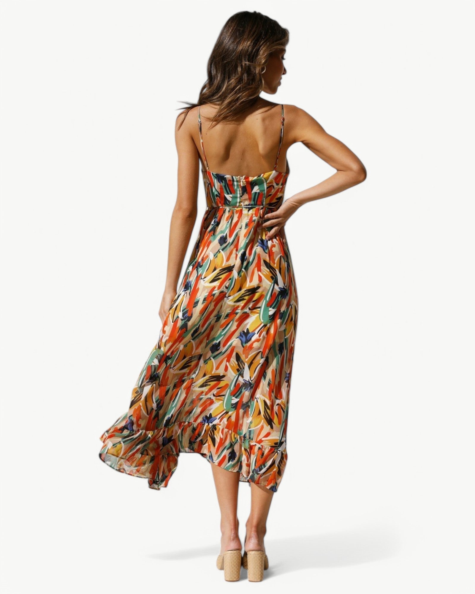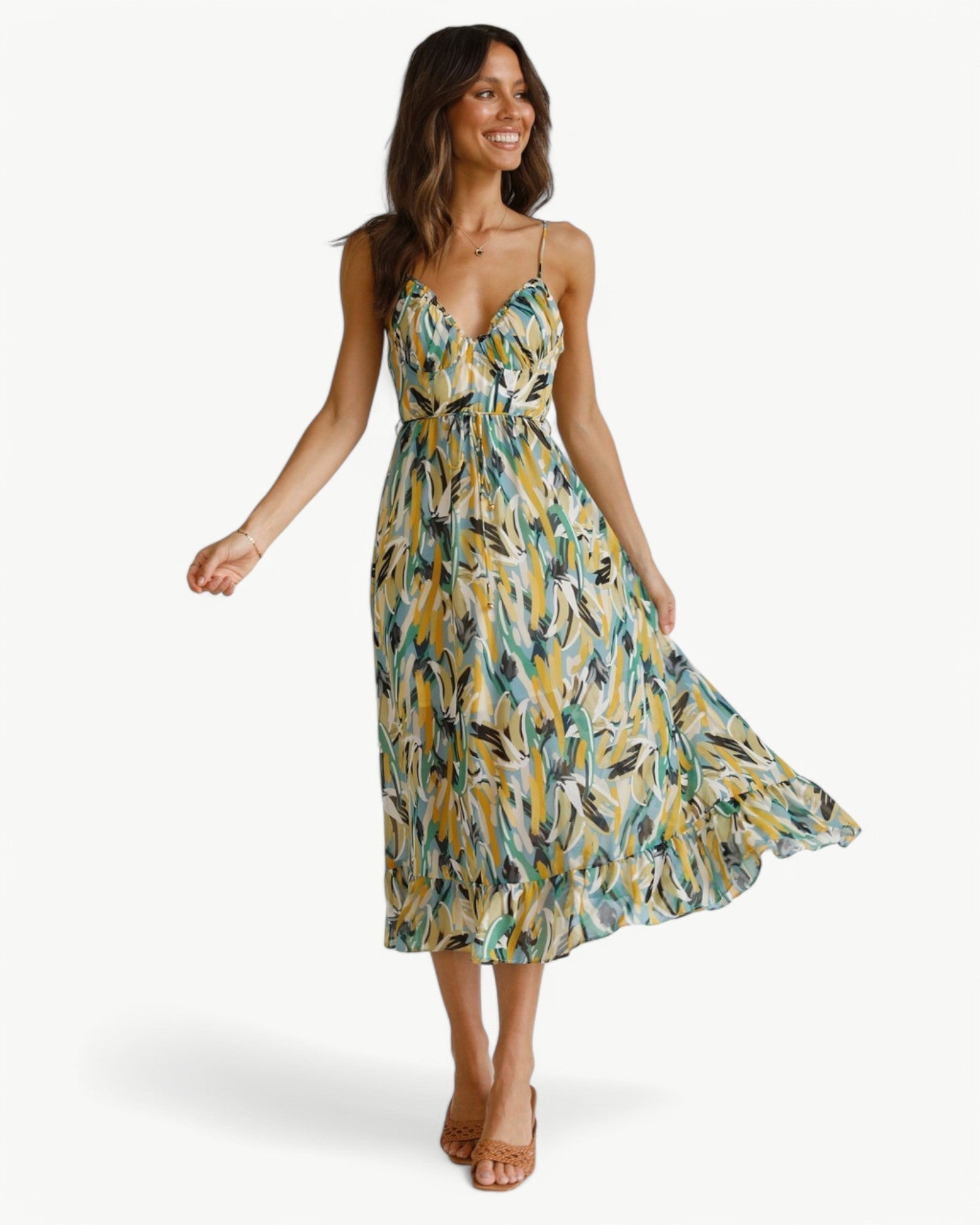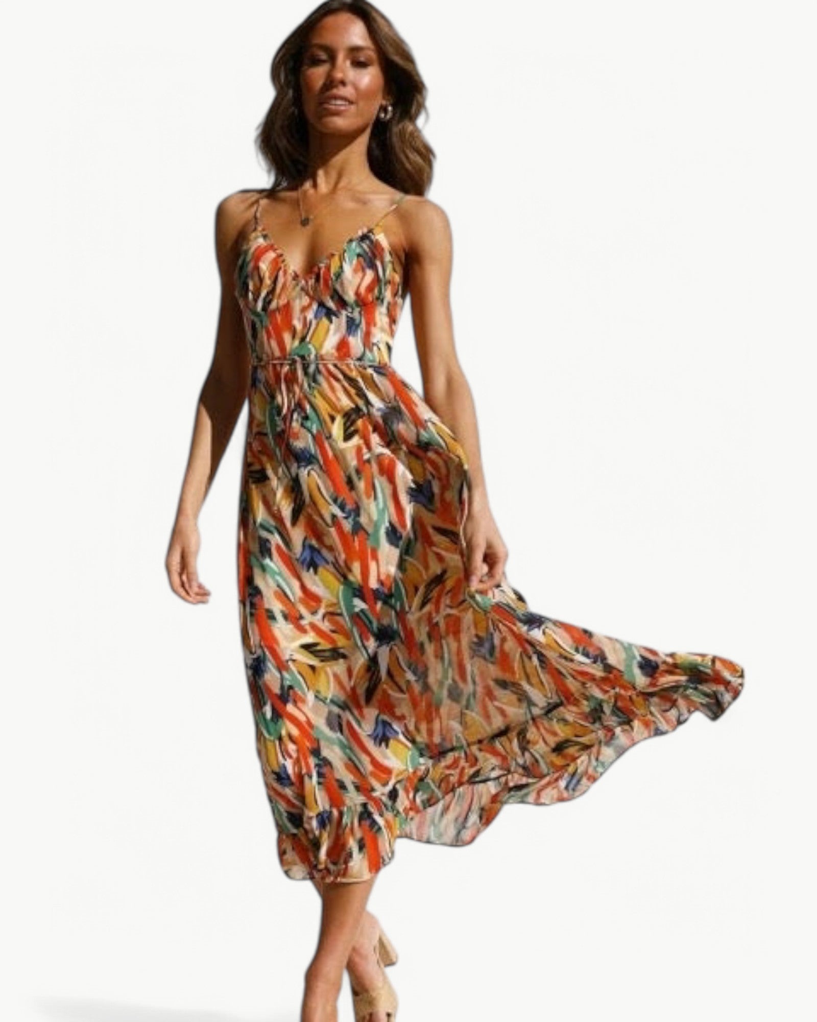 Sukienka midi z pięknym wzorem i wąskimi ramiączkami, która nadaje kobiecy i letni klimat. Prostsza stylizacja na słoneczne dni lub relaksujące okazje.