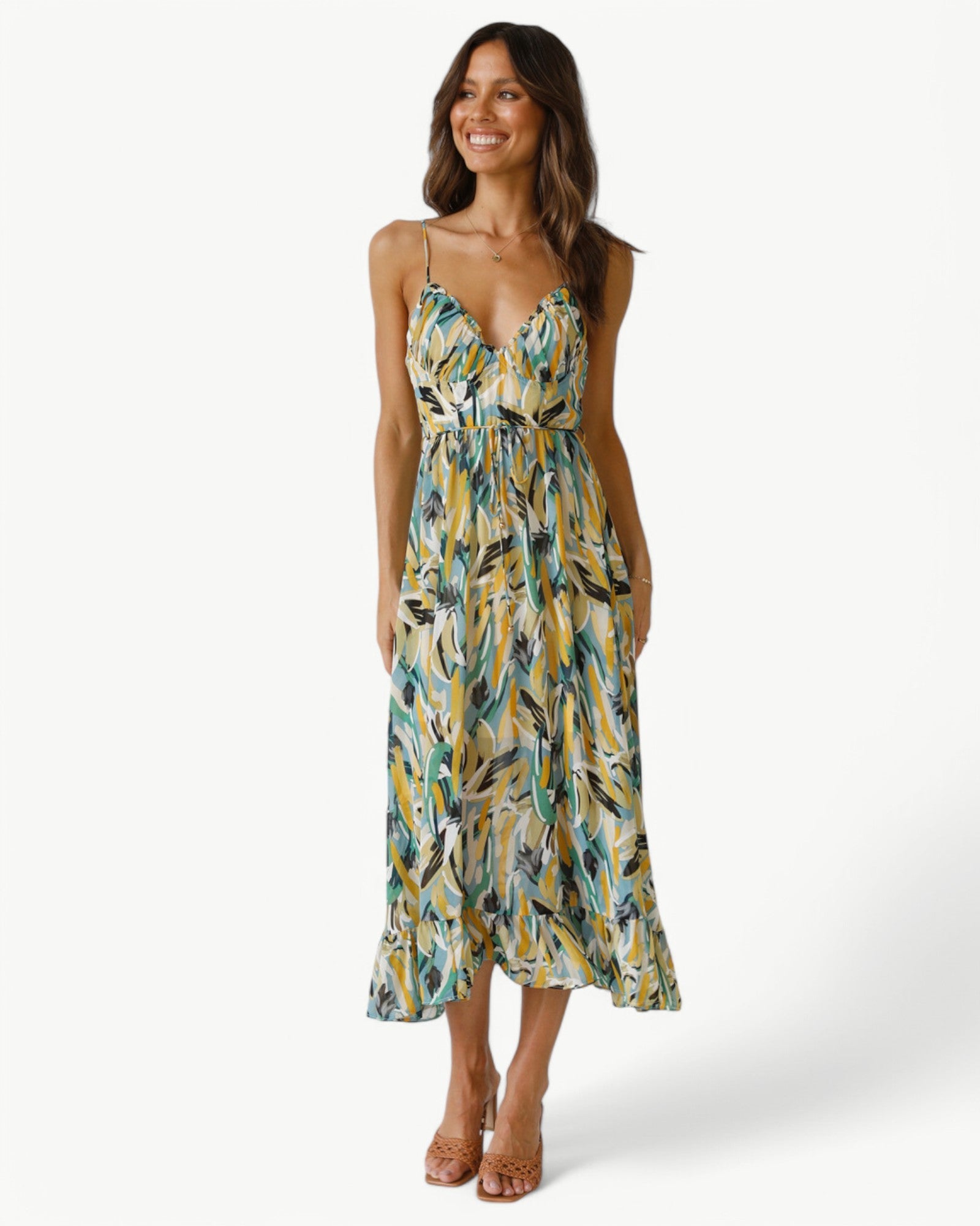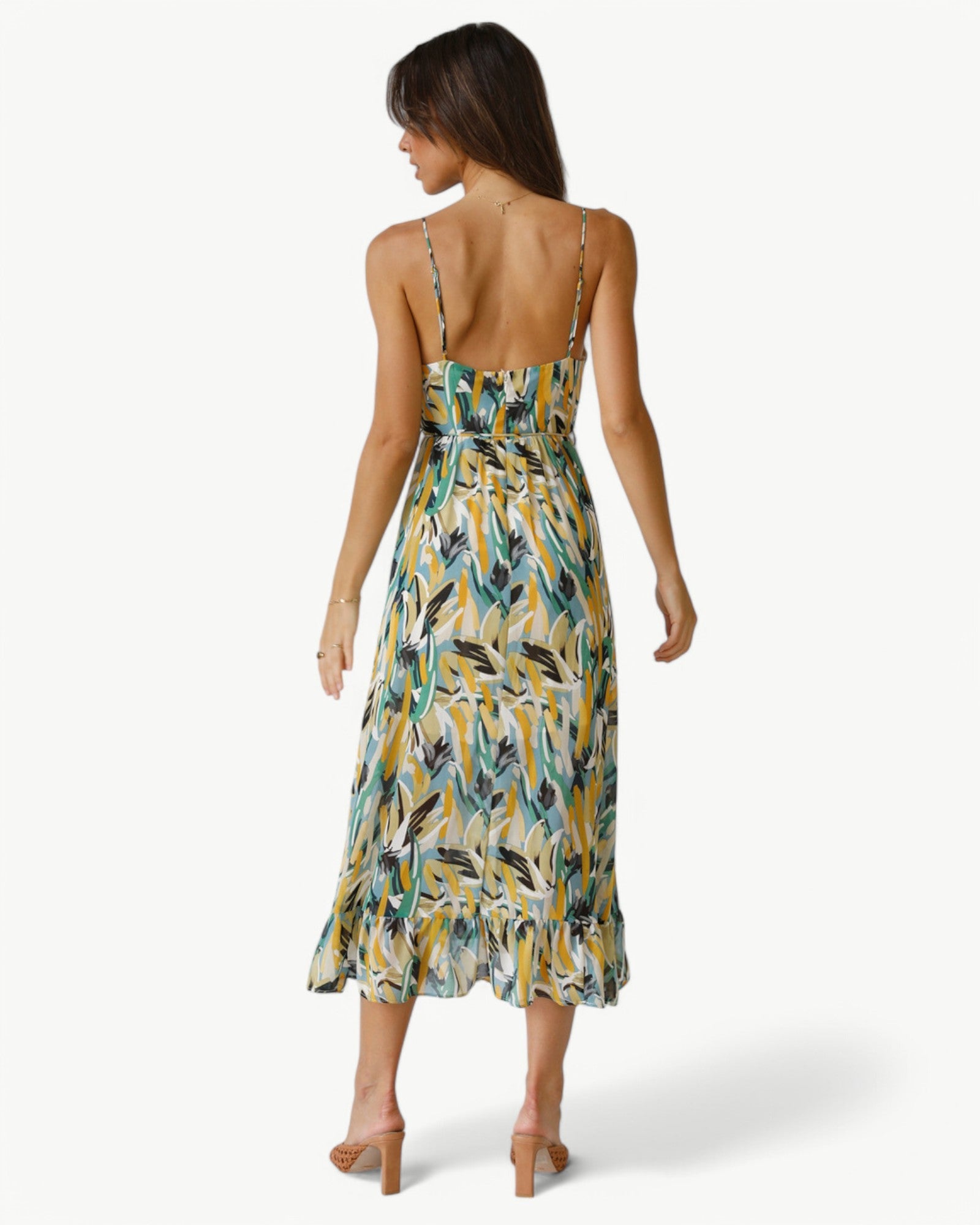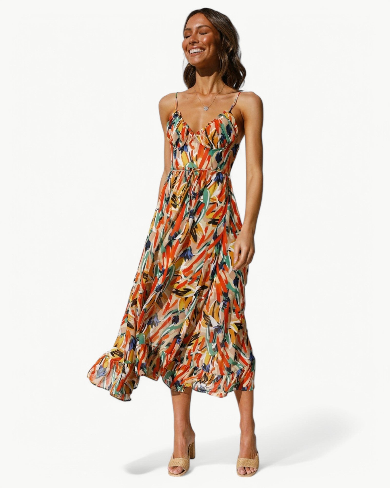 Sukienka midi z pięknym wzorem i wąskimi ramiączkami, która nadaje kobiecy i letni klimat. Prostsza stylizacja na słoneczne dni lub relaksujące okazje.