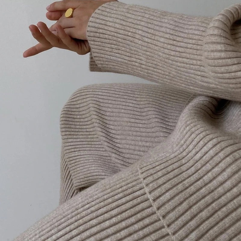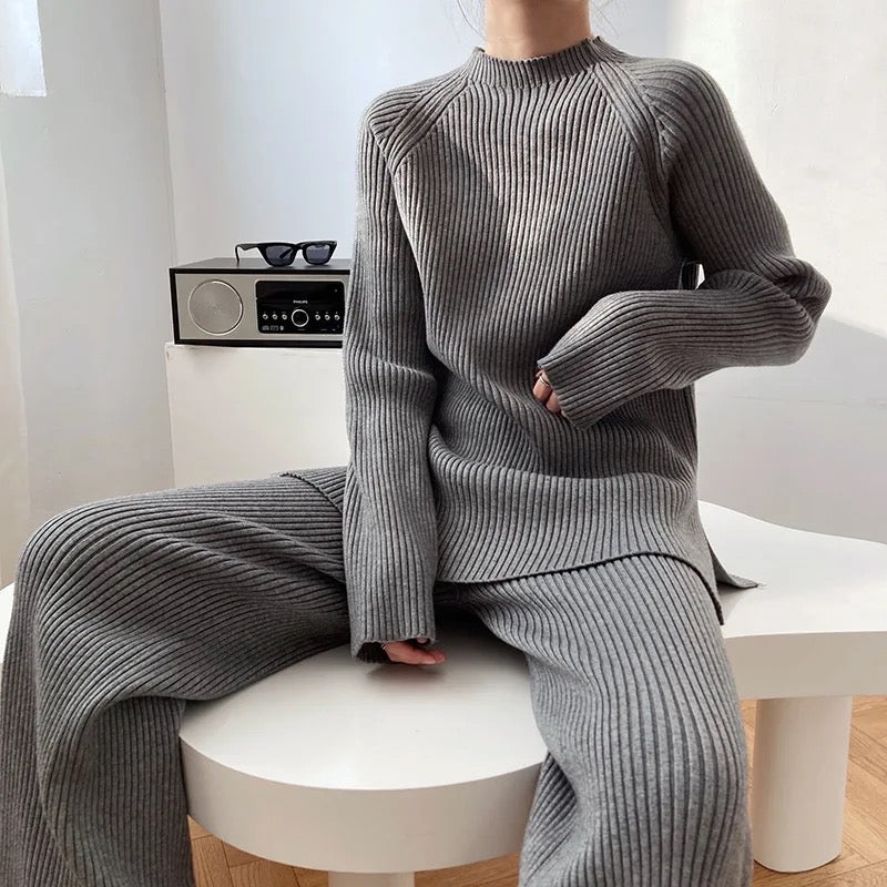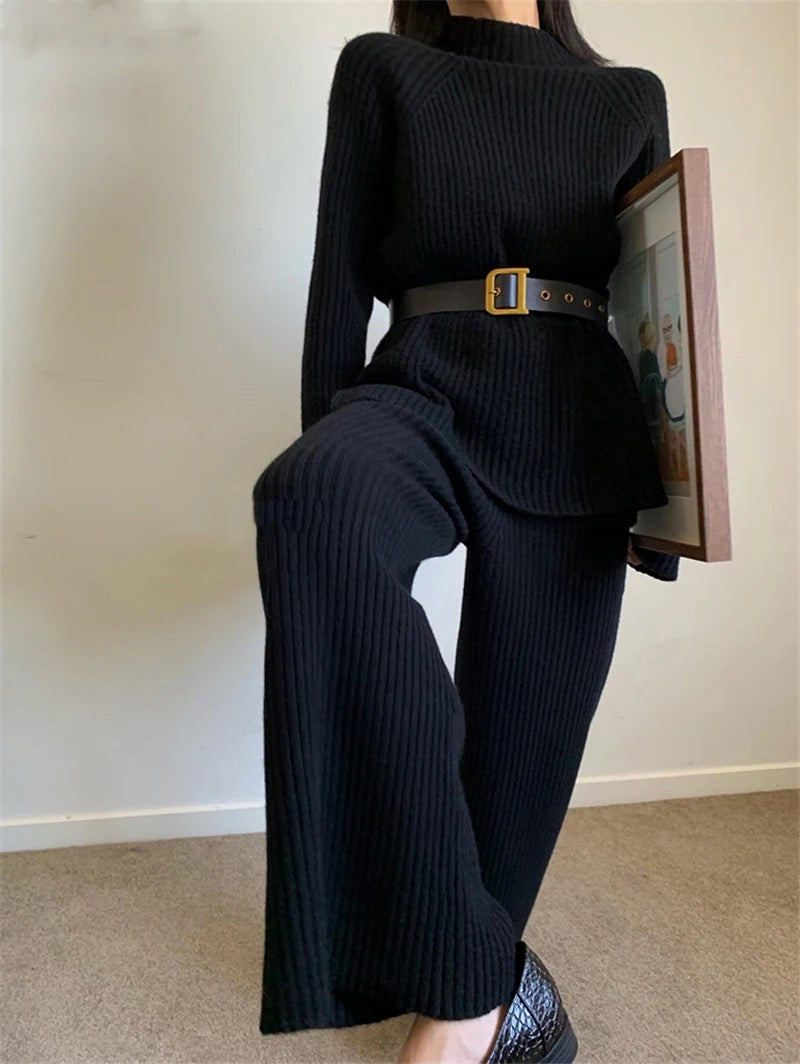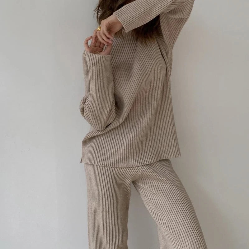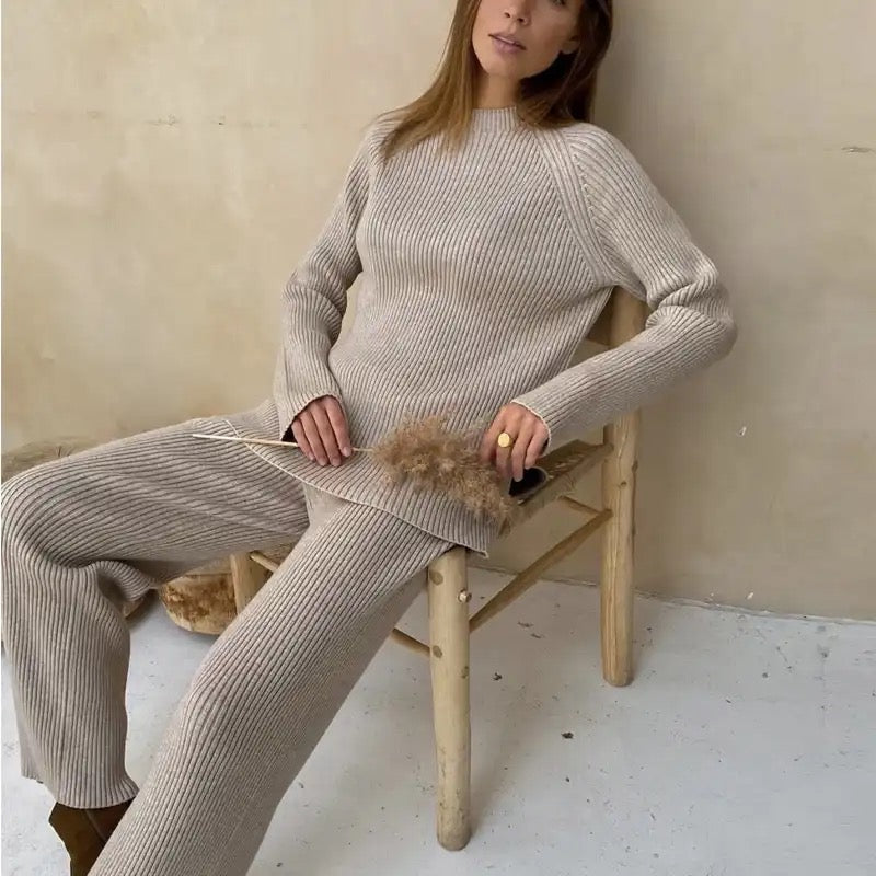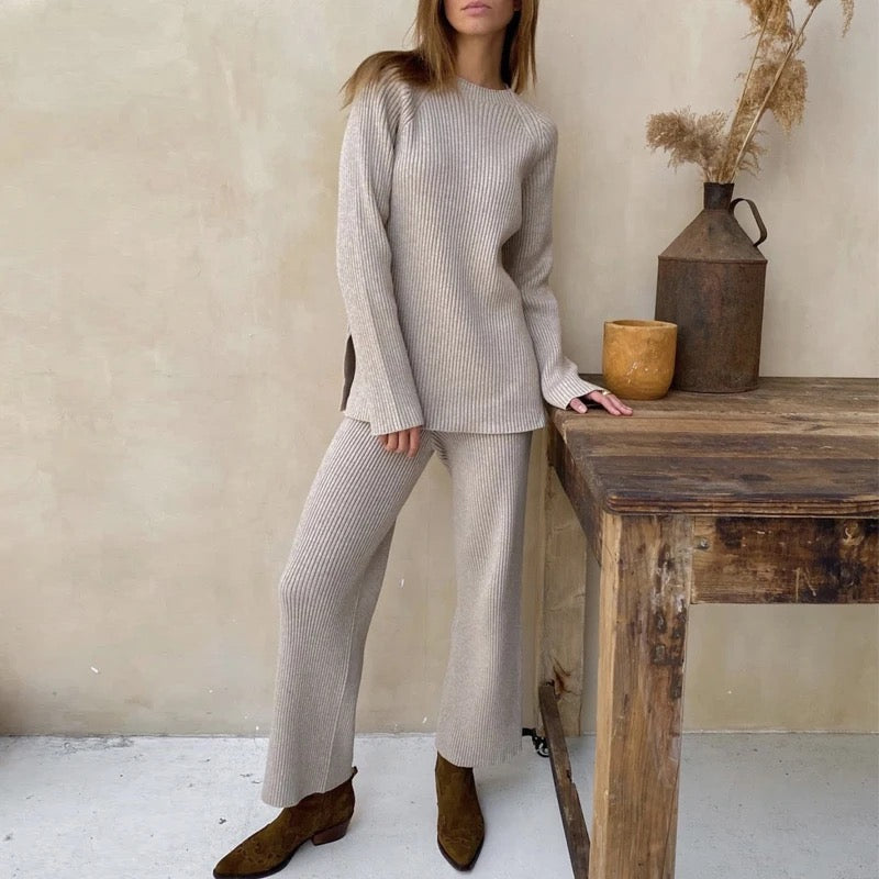 Zaktualizuj swoją garderobę z SOFIA, eleganckim i wszechstronnym 2-częściowym zestawem ribbstickanym. Zestaw składa się z stylowej bluzki z okrągłym dekoltem i subtelnie podwyższonym kołnierzem, co nadaje Twojemu wyglądowi wyrafinowany akcent. Bluzka ma luźny krój, który siedzi swobodnie, nie będąc przy tym oversize, co czyni ją idealną zarówno na co dzień, jak i na bardziej eleganckie okazje.