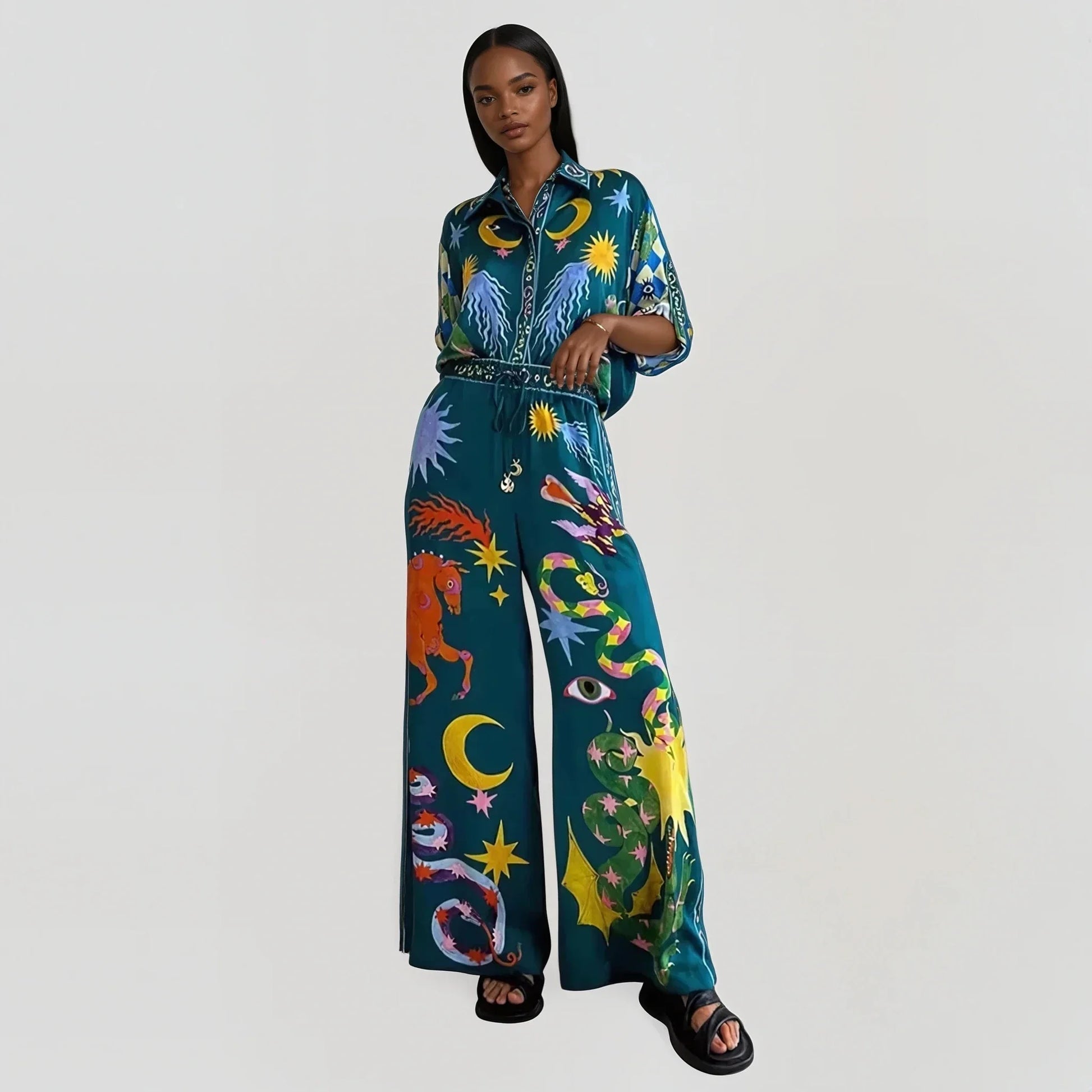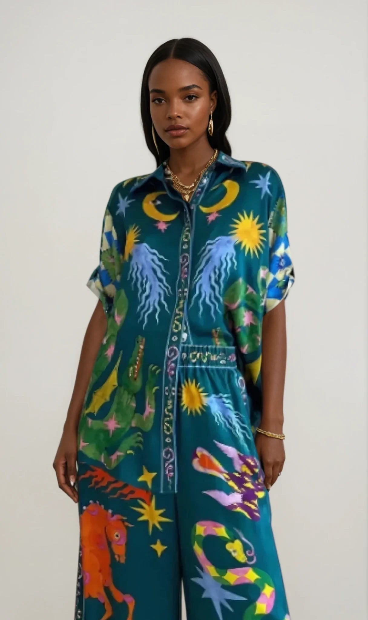Odkryj SOLÈNE, stylowy i artystyczny 2-częściowy zestaw z kolekcji SUNRISE BLOOM. Zaprojektowany z lekkiego i przewiewnego materiału, ten zestaw jest idealny na ciepłe dni, wakacje i swobodny, ale elegancki wygląd. Dzięki swojemu unikalnemu wzorowi i nadrukowi, nadaje Twojej garderobie wyrafinowany akcent.