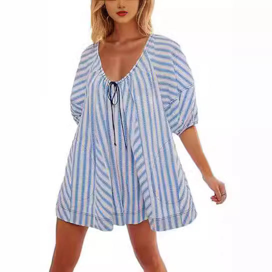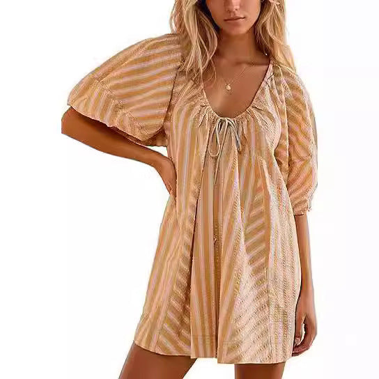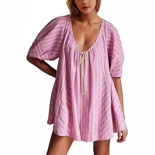 Przewiewny i elegancki krótki kombinezon z obszernymi rękawami, dekoltem w serek z wiązaniem oraz zabawnym paskowanym wzorem. Idealny na ciepłe dni, wakacje i relaksujące chwile – dostępny w kilku kolorach.