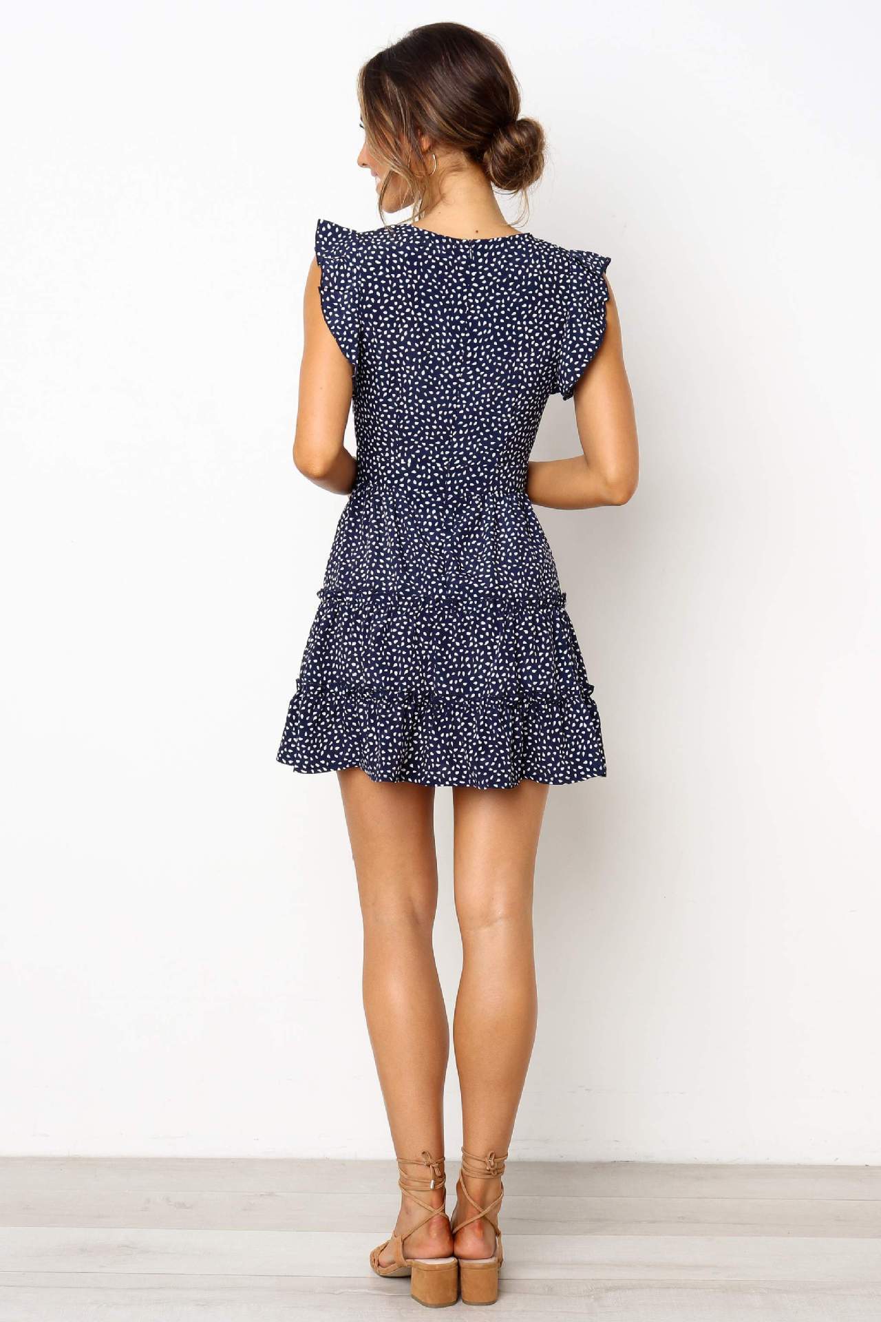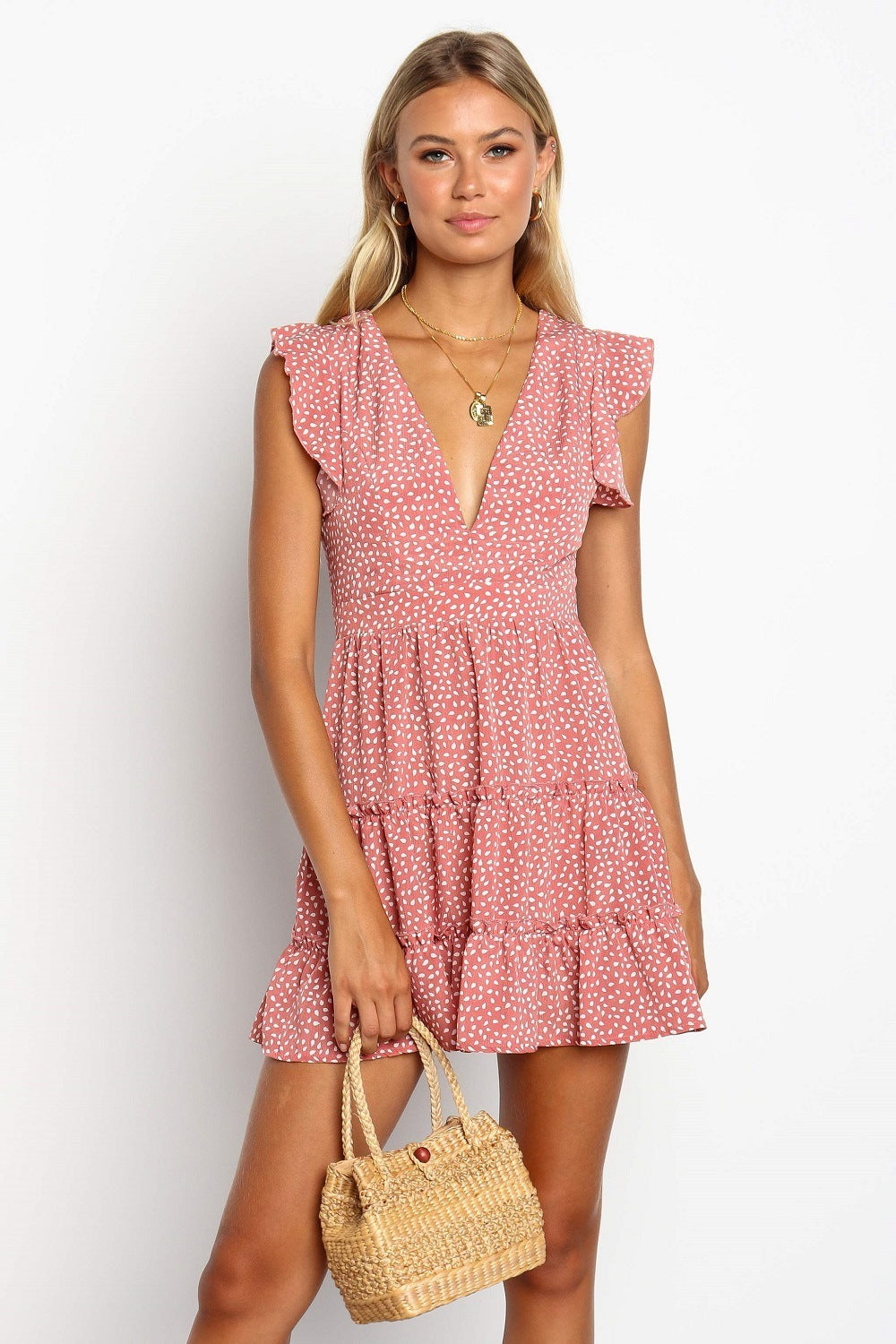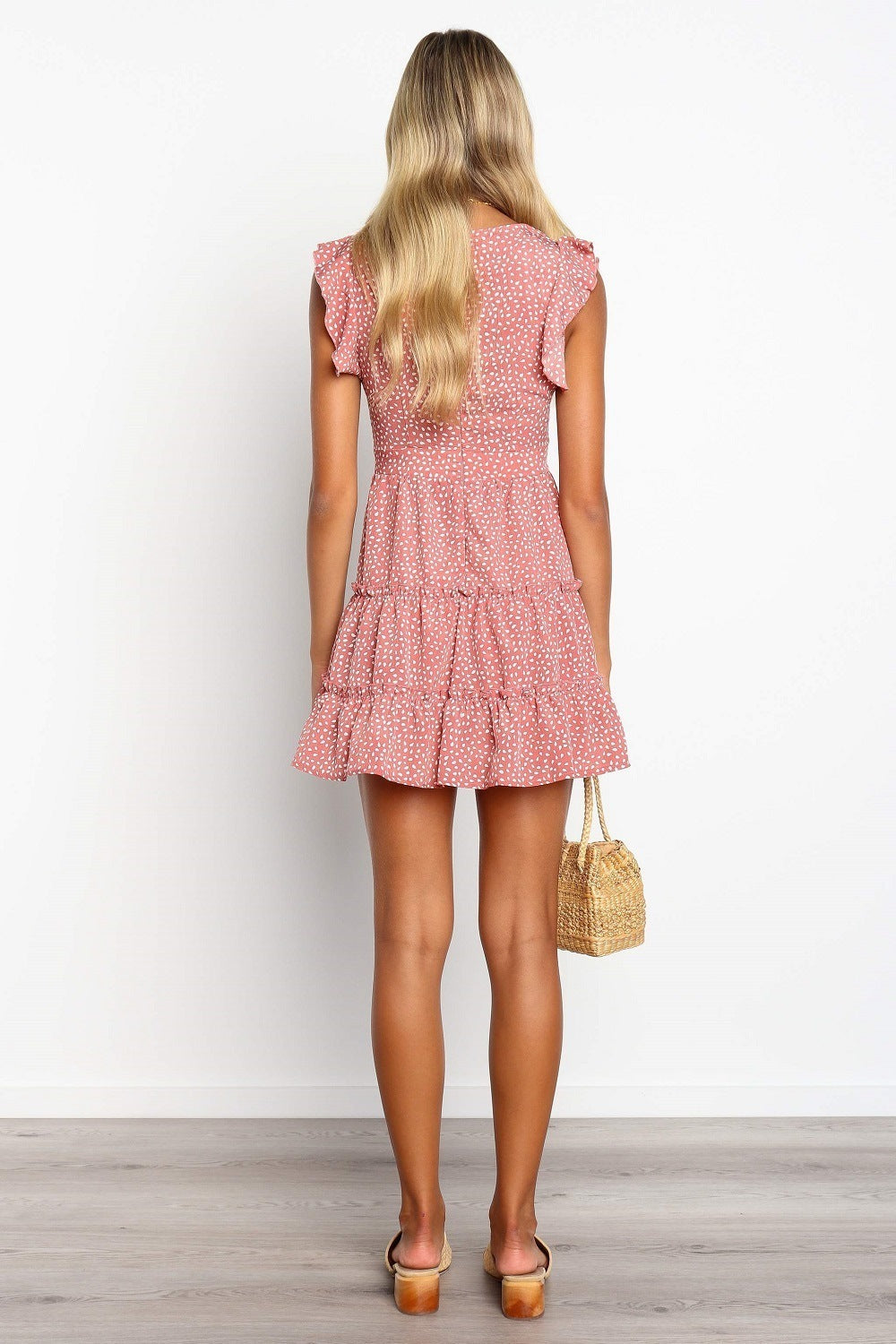 Krótka i przewiewna sukienka z dekoltem w kształcie litery V i bez rękawów. Letni ulubieniec, który sprawdzi się zarówno na plaży, jak i podczas relaksującego dnia w mieście.